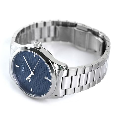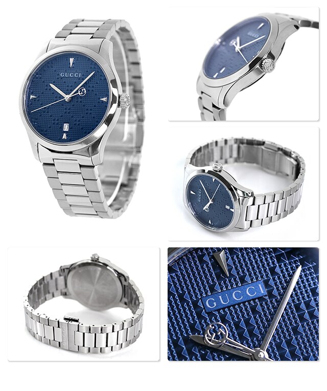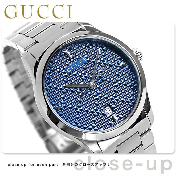 7年保証キャンペーン グッチ Gタイムレス 38mm スイス製 クオーツ メンズ 腕時計 YA1264025A GUCCI G-Timeless アナログ ブルー ◆1921年、グッチオ・グッチは革製品の会社を起業し、フィレンツェに小さな鞄店を開業。ブランドに対する彼のビジョンは、ロンドンと、彼がサボイ・ホテルで働いていた時に見た英国貴族の洗練された審美眼から培われたものです。財布や革製品以外にもアクセサリーや腕時計も品質の高さや、洗練されたデザインが人気で一気に高級ブランドの地位を確立しました。今では名を知らない人はいないぐらい世界的に有名なブランドです。 時代に左右されないクラシカルでスタイリッシュなデザインが特徴のGタイムレスシリーズ。文字盤にはグッチのシグネチャーである、ダイヤモンドシェイプからインスピレーションを得たディアマンテパターンがあしらわれています。12・3・6・9時にくさび形のインデックスを使用。誕生日や記念日などのプレゼントにはもちろん、ペアウォッチとしてもおすすめです。