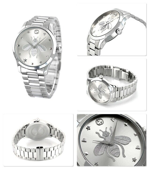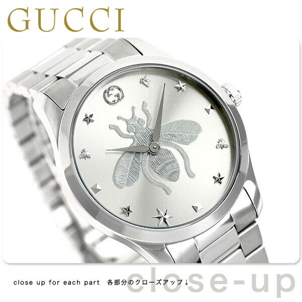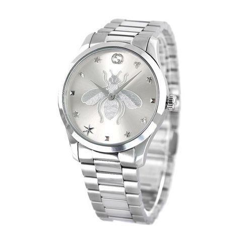 7年保証キャンペーン グッチ Gタイムレス 38mm スイス製 クオーツ ユニセックス メンズ レディース 腕時計 YA1264126 GUCCI G-TIMELESS アナログ シルバー ◆1921年、グッチオ・グッチは革製品の会社を起業し、フィレンツェに小さな鞄店を開業。ブランドに対する彼のビジョンは、ロンドンと、彼がサボイ・ホテルで働いていた時に見た英国貴族の洗練された審美眼から培われたものです。財布や革製品以外にもアクセサリーや腕時計も品質の高さや、洗練されたデザインが人気で一気に高級ブランドの地位を確立しました。今では名を知らない人はいないぐらい世界的に有名なブランドです。 文字盤中央に、大胆に蜂をデザインしたモデル。インデックスに採用した蜂や星もポイントです。