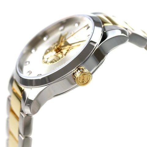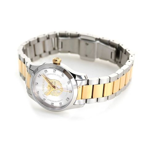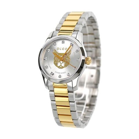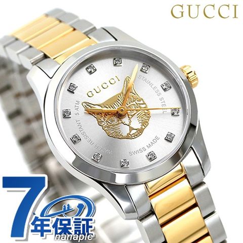 7年保証キャンペーン グッチ Gタイムレス 27mm スイス製 クオーツ レディース 腕時計 YA1265016 GUCCI G-TIMELESS アナログ シルバー×ゴールド ◆1921年、グッチオ・グッチは革製品の会社を起業し、フィレンツェに小さな鞄店を開業。ブランドに対する彼のビジョンは、ロンドンと、彼がサボイ・ホテルで働いていた時に見た英国貴族の洗練された審美眼から培われたものです。財布や革製品以外にもアクセサリーや腕時計も品質の高さや、洗練されたデザインが人気で一気に高級ブランドの地位を確立しました。今では名を知らない人はいないぐらい世界的に有名なブランドです。 時代に左右されないクラシカルでスタイリッシュなデザインが特徴のGタイムレスシリーズ。文字盤中央にデザインされた猫が特徴のモデル。