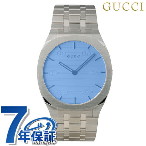 7年保証キャンペーン グッチ スイス製 メンズ レディース 腕時計 YA163408 GUCCI GUCCI 25H アナログ ブルー ◆1921年、グッチオ・グッチは革製品の会社を起業し、フィレンツェに小さな鞄店を開業。ブランドに対する彼のビジョンは、ロンドンと、彼がサボイ・ホテルで働いていた時に見た英国貴族の洗練された審美眼から培われたものです。財布や革製品以外にもアクセサリーや腕時計も品質の高さや、洗練されたデザインが人気で一気に高級ブランドの地位を確立しました。今では名を知らない人はいないぐらい世界的に有名なブランドです。 ダイヤルにはグッチのアイコン“インターロッキングG”とボーダーが施されています。軽やかな着け心地で手元をスタイリッシュに彩ります。