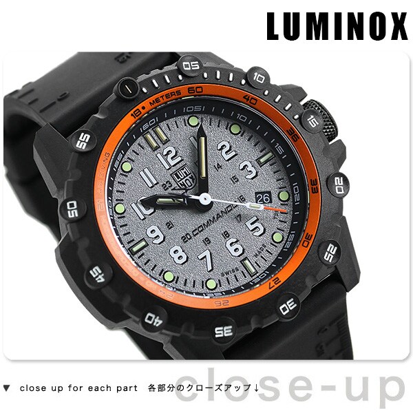 7年保証キャンペーン ルミノックス コマンドー フロッグマン 3300 シリーズ 51mm スイス製 クオーツ メンズ 腕時計 l3301 LUMINOX HE COMMANDO FROGMAN 3300 SERIES アナログ グレー×ブラック ◆極限の状況下で行われるミッションで必要となる視認性を確保しているルミノックス時計は、特殊軍用時計として絶対的な信頼感を得ています。 第一次世界大戦以降、水中での軍事活動を行う潜水特殊部隊「フロッグマン」と名付けられたウォッチ。Recon(偵察部隊)シリーズのデザインを行った軍事専門家アンドレア・ミケーリ氏の監修で、ミリタリーテイストが満載です。ベゼルには、エアー残量の計測と同時にオレンジのアルミニウムリングに刻印された無減圧限界時間ゲージが装備されています。ストラップには、リーコン同様のミリタリースケールを刻印。文字盤のネイビー(海軍)フォントのインデックス、バトルシップ(戦艦)に使われるグレーカラーが秀逸です。