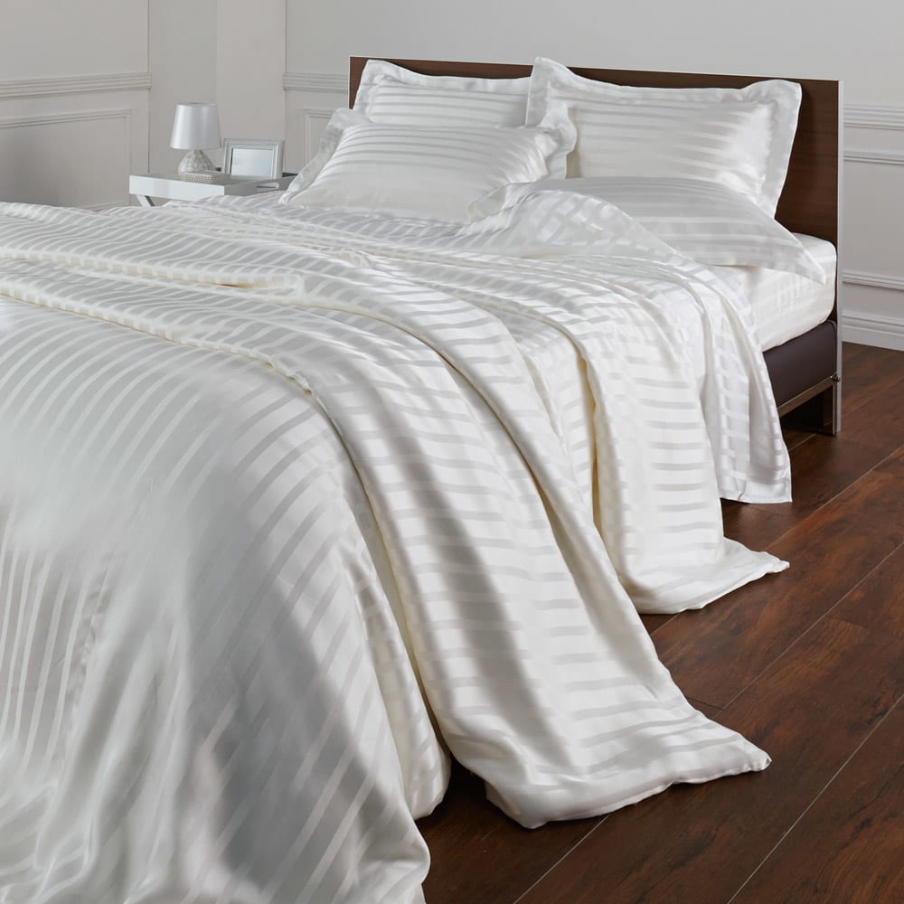 しっとりやさしい肌ざわりと、気品あふれる光沢をまとった美しさが魅力の高級シルクを、日常使いで思う存分味わっていただきたいという想いから生まれたカバーリングシリーズです。さりげないストライプ柄が、寝室のラグジュアリーなアクセントに。毎晩ご自宅で、目も肌も心も満たされる幸せな眠りを。