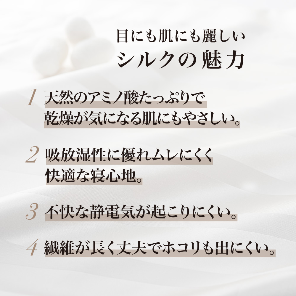天然のアミノ酸たっぷりのシルクは乾燥が気になる肌にもやさしく、高い吸放湿性でムレにくく快適な使い心地。不快な静電気も起こりにくく、繊維が長く丈夫なのでホコリが出にくいのも特長です。