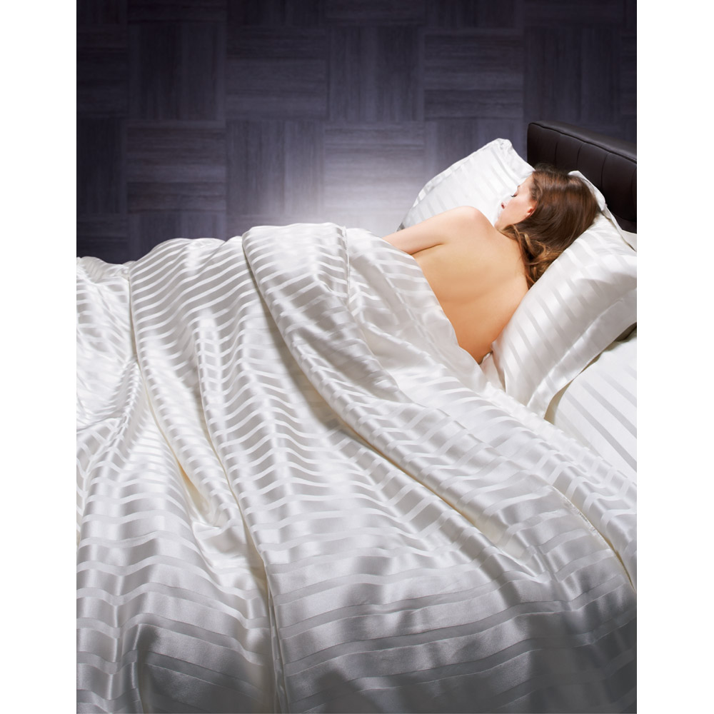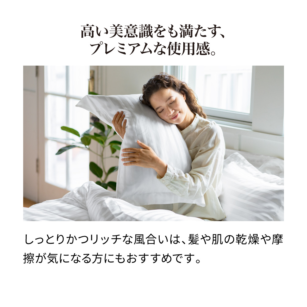 しっとりやさしい肌ざわりと、気品あふれる光沢をまとった美しさが魅力の高級シルクを、日常使いで思う存分味わっていただきたいという想いから生まれたカバーリングシリーズです。さりげないストライプ柄が、寝室のラグジュアリーなアクセントに。毎晩ご自宅で、目も肌も心も満たされる幸せな眠りを。