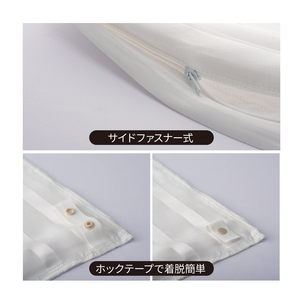 掛け布団カバーは着脱しやすいサイドファスナー式。内側のホックテープで布団とカバーをパチッと簡単に固定できて、使用中もズレにくく快適です。シルク製品はドライクリーニング指定が多い中、ご自宅の洗濯機で洗える使いやすさもポイントです。 ※洗濯ネット使用
