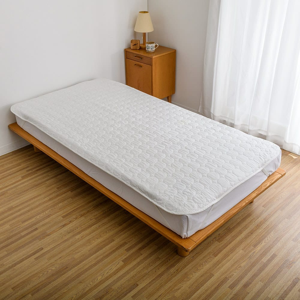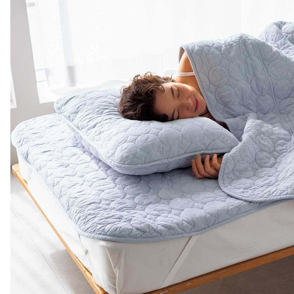 シーツ代わりにお使いのマットレスや敷布団につけるだけでふわふわの寝心地に。汗をぐんぐん吸うから熱のこもりやすい背中もサラリ。冬はひんやりせず、空気の層が暖かさを保ちます。