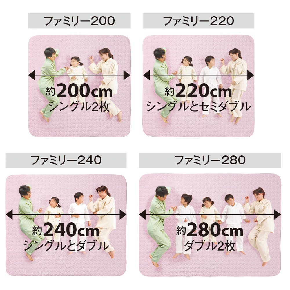 ファミリー布団や並べたベッド・敷布団をまとめて覆えるファミリーサイズ。家族みんなでパシーマ(R)の気持ちいい肌触りを味わえます。