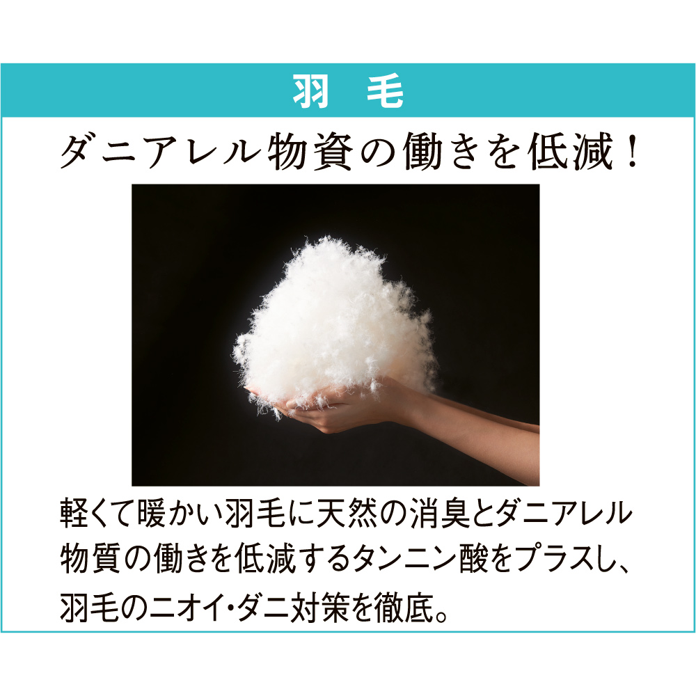羽毛ダニアレル物資の働きを低減!軽くて暖かい羽毛に天然の消臭とダニアレル物質の働きを低減するタンニン酸をプラスし、羽毛のニオイ・ダニ対策を徹底。