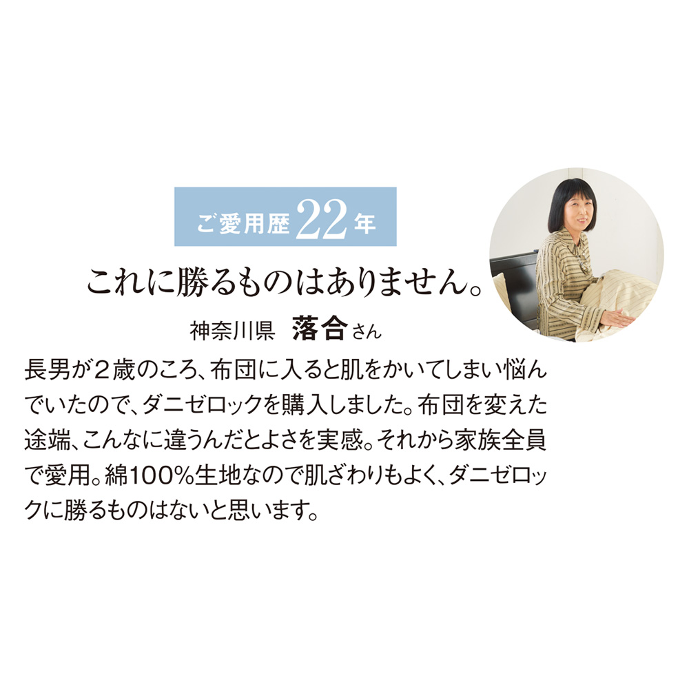 長男が2歳のころ、布団に入ると肌をかいてしまい悩んでいたので、ダニゼロックを購入しました。布団を変えた途端、こんなに違うんだと良さを実感。それから家族全員で愛用。旅行にもシーツ類を持って行きますし、社会人になって実家を離れた長男も使っています。綿100%生地なので肌触りもよく、ダニゼロックに勝るものはないと思います。これからも使い続けたいと思っています。※個人の感想であり、効果を保証するものではありません。