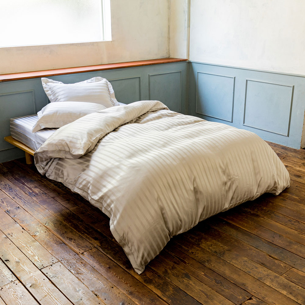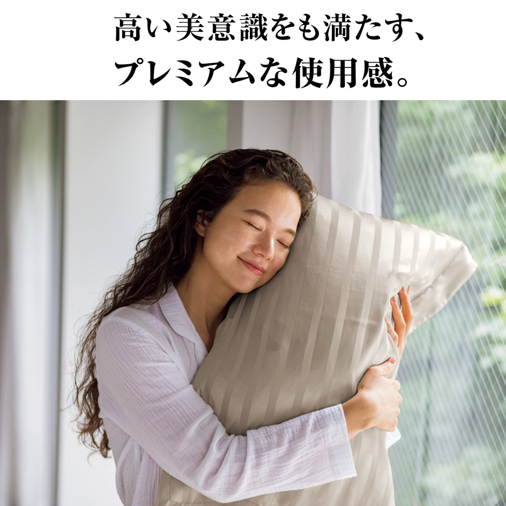 美しい光沢のサテン織りのシルクカバーはストライプの柄で上品&ラグジュアリーに。
