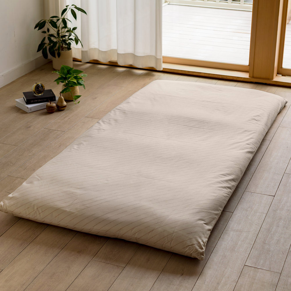 身体を支える固わたの中芯と、ふわふわタッチの巻きわたの組み合わせで、寝心地の良さとサポート力を両立。巻きわたには制菌機能付きの「デオメディカルコットン」を使用。清潔にお使いいただけます。