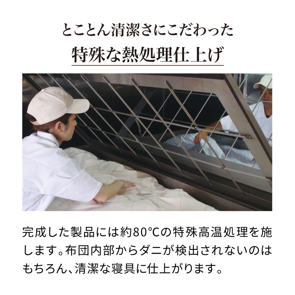 高品質なダニ対策寝具を作り続けて25年以上の老舗メーカーが、国内で1枚1枚丁寧に生産しています。縫い方ひとつにまでこだわった特殊製法のため、機械化できない工程は専門工場にて職人が手作業で行なっています。完成した製品には約80℃の特殊高温処理を施します。布団内部からダニが検出されないことはもちろん、清潔な寝具に仕上がります。