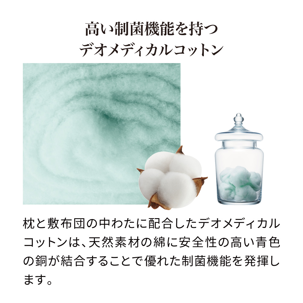 身体を支える固わたの中芯と、ふわふわタッチの巻きわたの組み合わせで、寝心地の良さとサポート力を両立。巻きわたには制菌機能付きの「デオメディカルコットン」を使用。清潔にお使いいただけます。