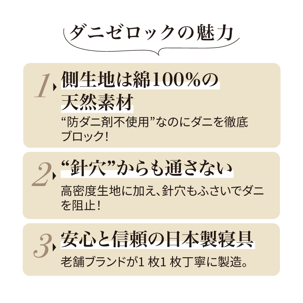 ダニゼロックの布団内部にはダニがゼロ!物理的にダニをブロックする構造なので、穴が開かない限りどんなに使っても防ダニ効果がなくなることはありません。商品画像の説明