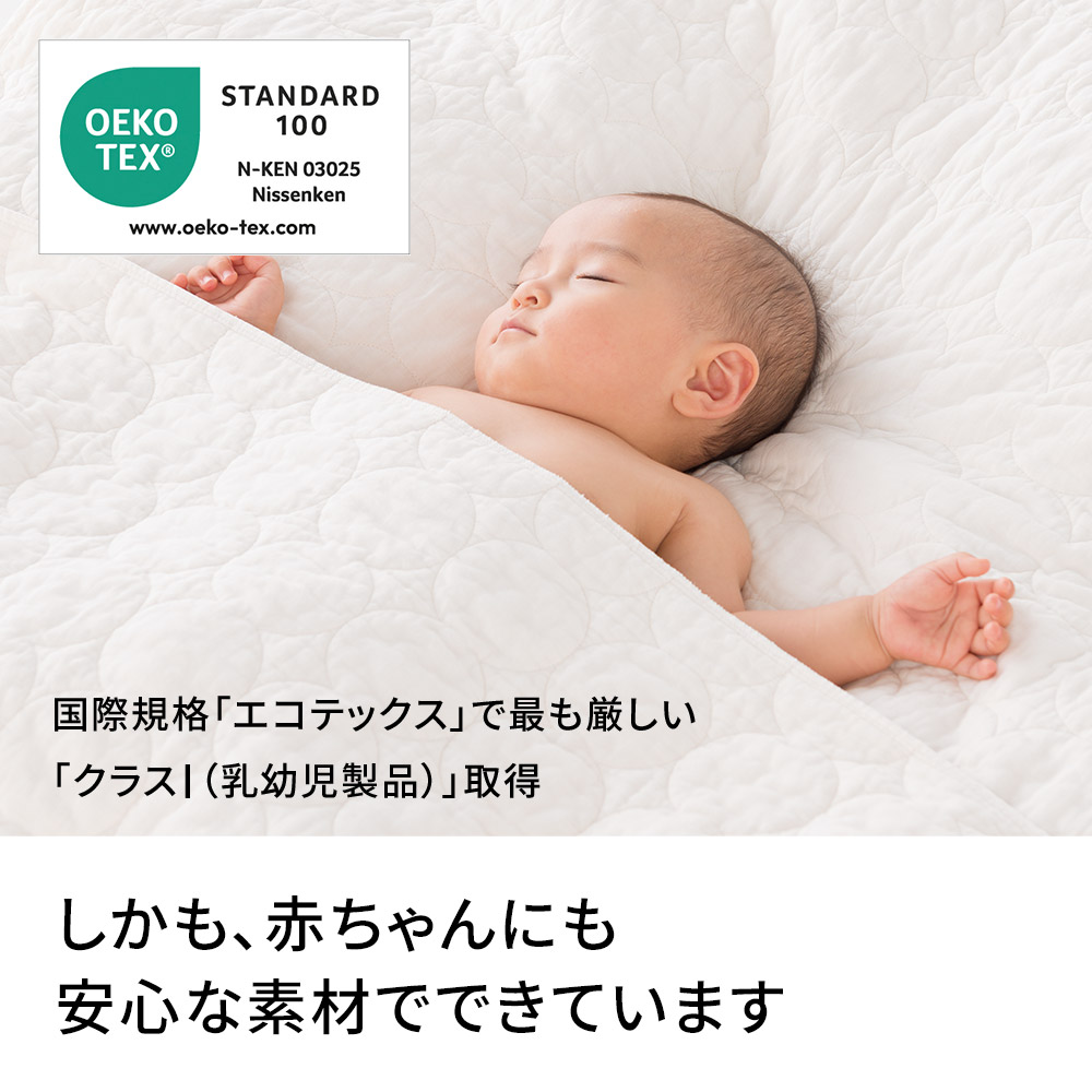350種類以上の有害化学物質が含まれていないことを証明する、世界最高水準の安全な繊維製品の証「エコテックススタンダード100」。その中でも最も厳しい「クラス1(乳幼児製品)」の認証を取得しています。赤ちゃんや肌が敏感な方、ご年配の方までご愛用いただけます。