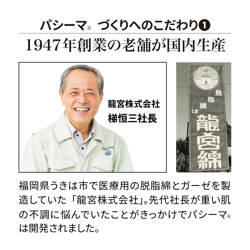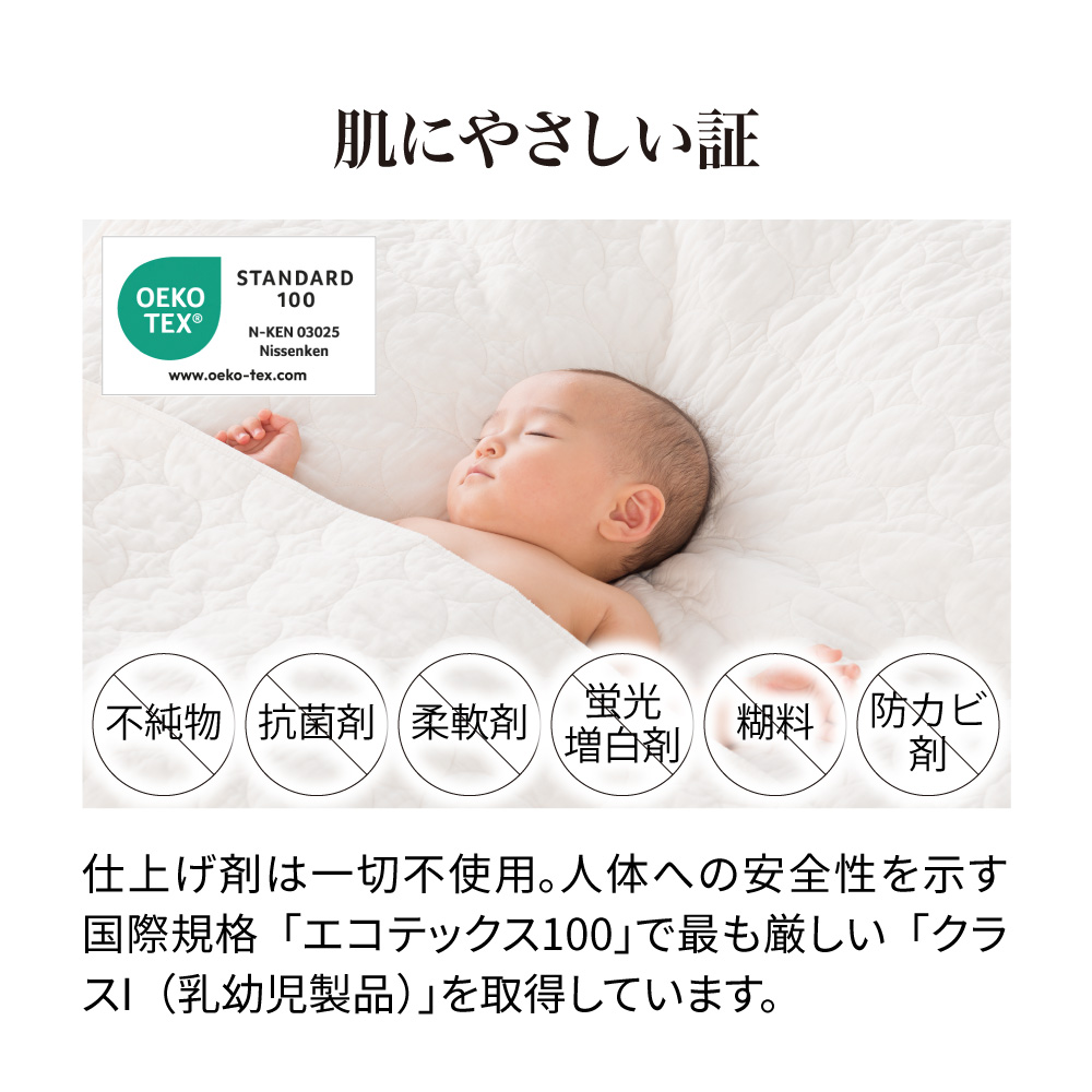 医療用レベルの純度まで精錬されたガーゼと脱脂綿だけを使用。一般的なガーゼより目が詰まっていて耐久性があり、ホコリが出にくいのも特長です。仕上げ剤は一切使用せず、人体への安全性を示す国際規格「エコテックス100」で最も厳しい「クラスI(乳幼児製品)」を取得しています。