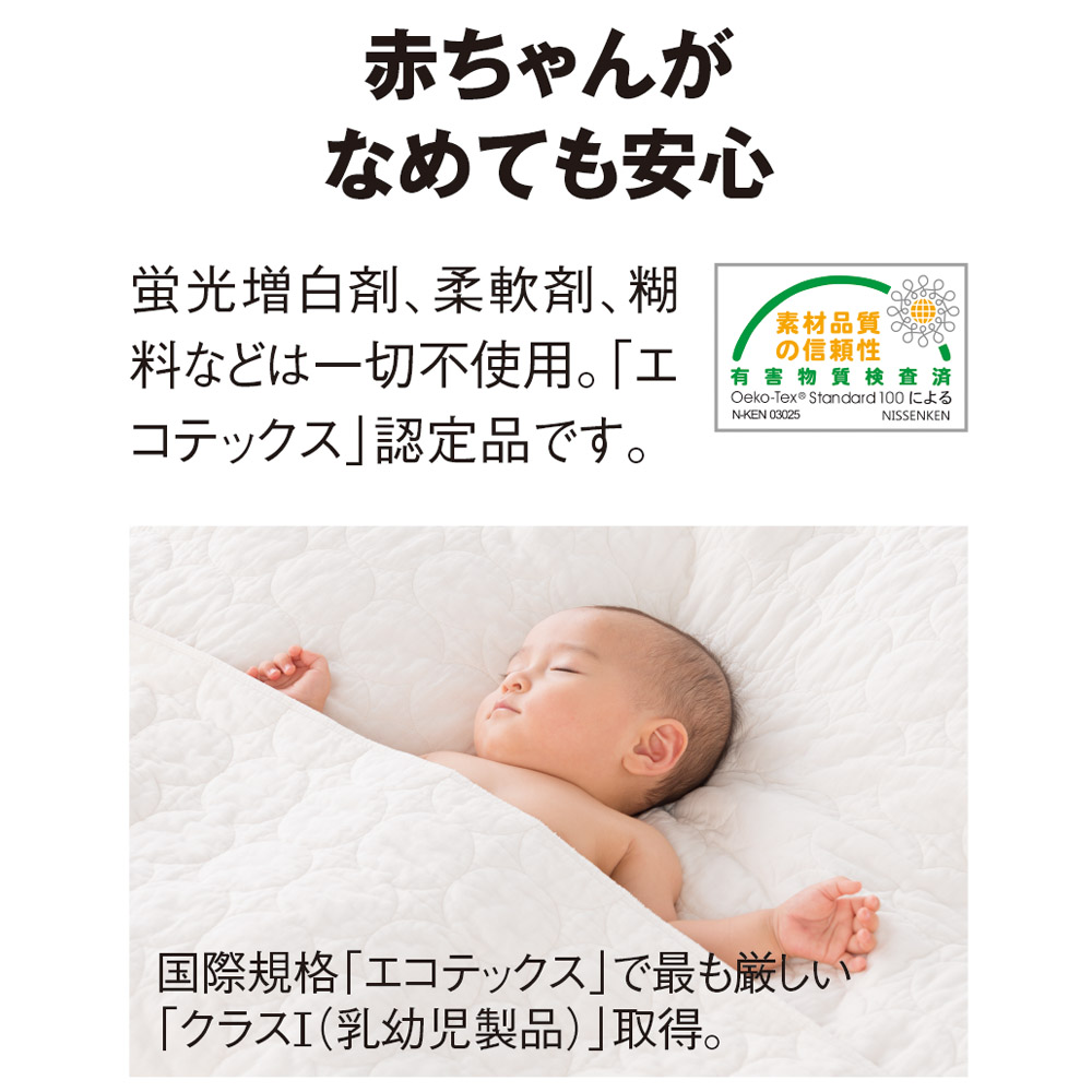 「エコテックススタンダード100」で、もっとも厳しい分類「クラス1」を取得。赤ちゃんがなめても安全な品質基準をクリアしてます。