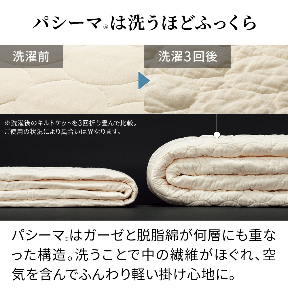 寝具選びに悩まれている方、収納スペースをすっきりさせたい方、そしてパシーマファンの方にも、自信をもっておすすめできる一枚です。