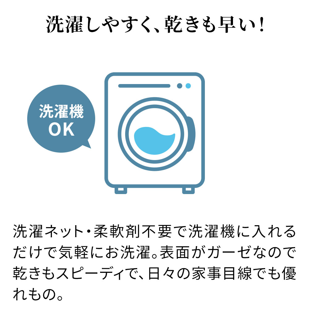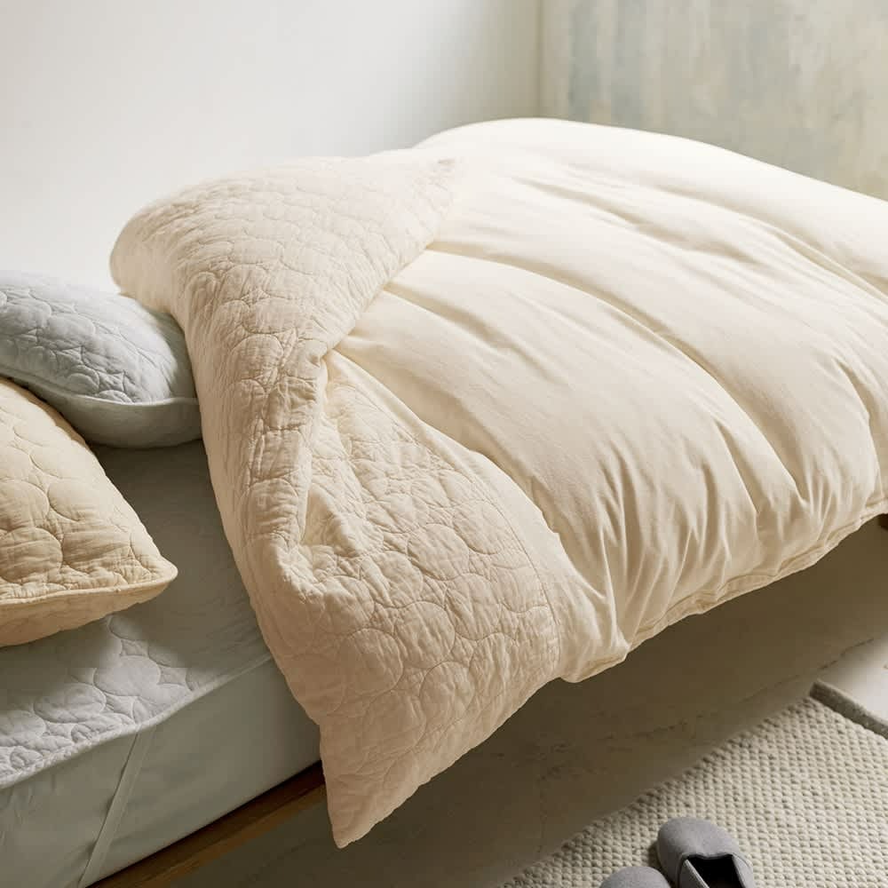 頬や首筋に触れる襟元の折り返しには、やさしいぬくもりのパシーマキルト生地を使用。表面は布団のボリュームをつぶさないガーゼ生地を使用し、やわらかさと“もっちり幸せ”な心地よさを両立しました。