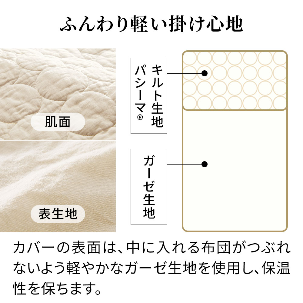 肌に触れる面はパシーマ生地、表面はガーゼ生地を組み合わせ、パシーマの心地よい肌ざわりと布団のもっちり感を両立。