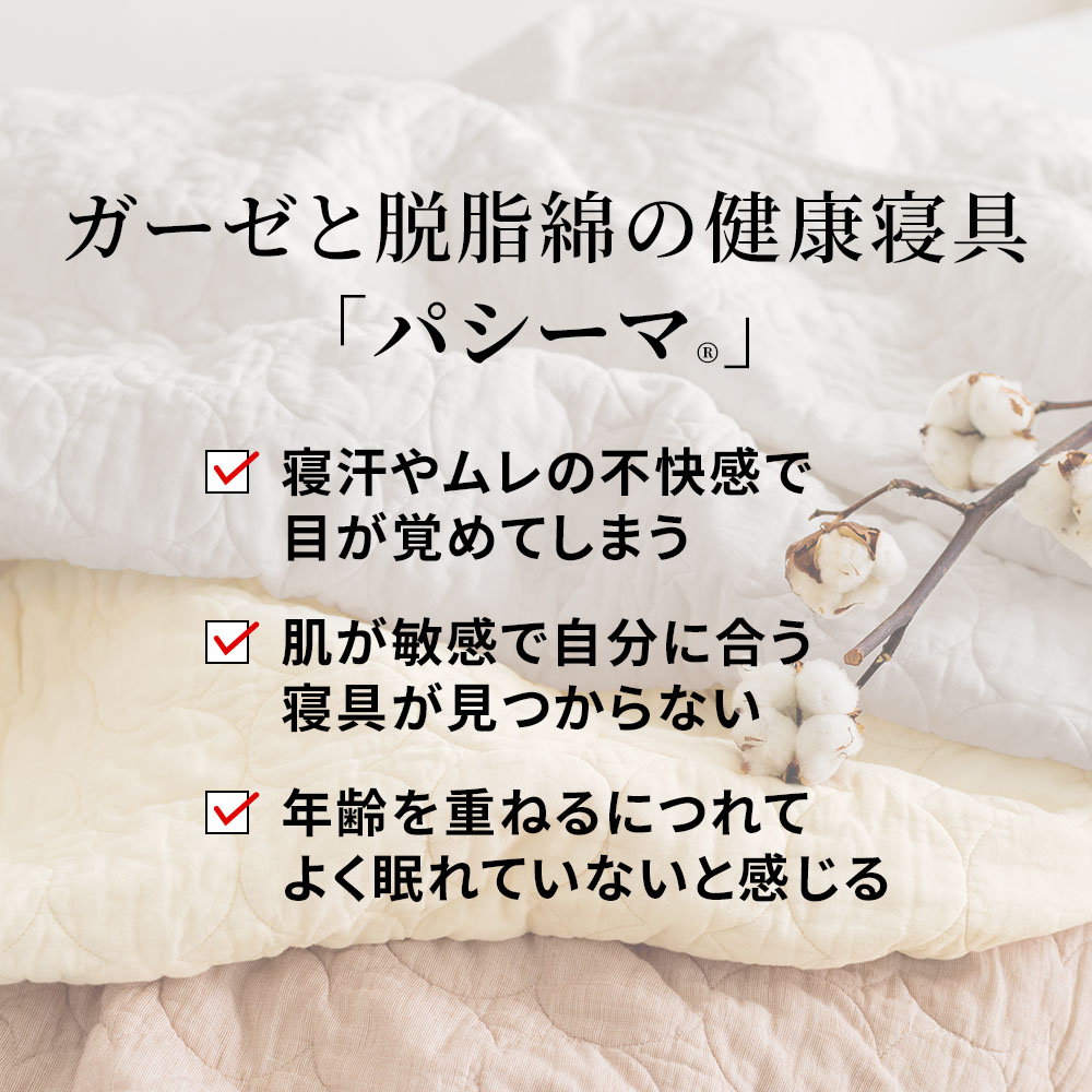 「もっとパシーマを贅沢に使いたい」「一年中快適に眠りたい」―そんなご要望から生まれた本品は、何度も試作を重ね、「眠り」という品質にこだわった一枚に仕上がりました。夏の寝苦しい夜も、冬の冷え込む朝も、いつでもパシーマのやさしい肌触りに包まれる安心感をお届けします。