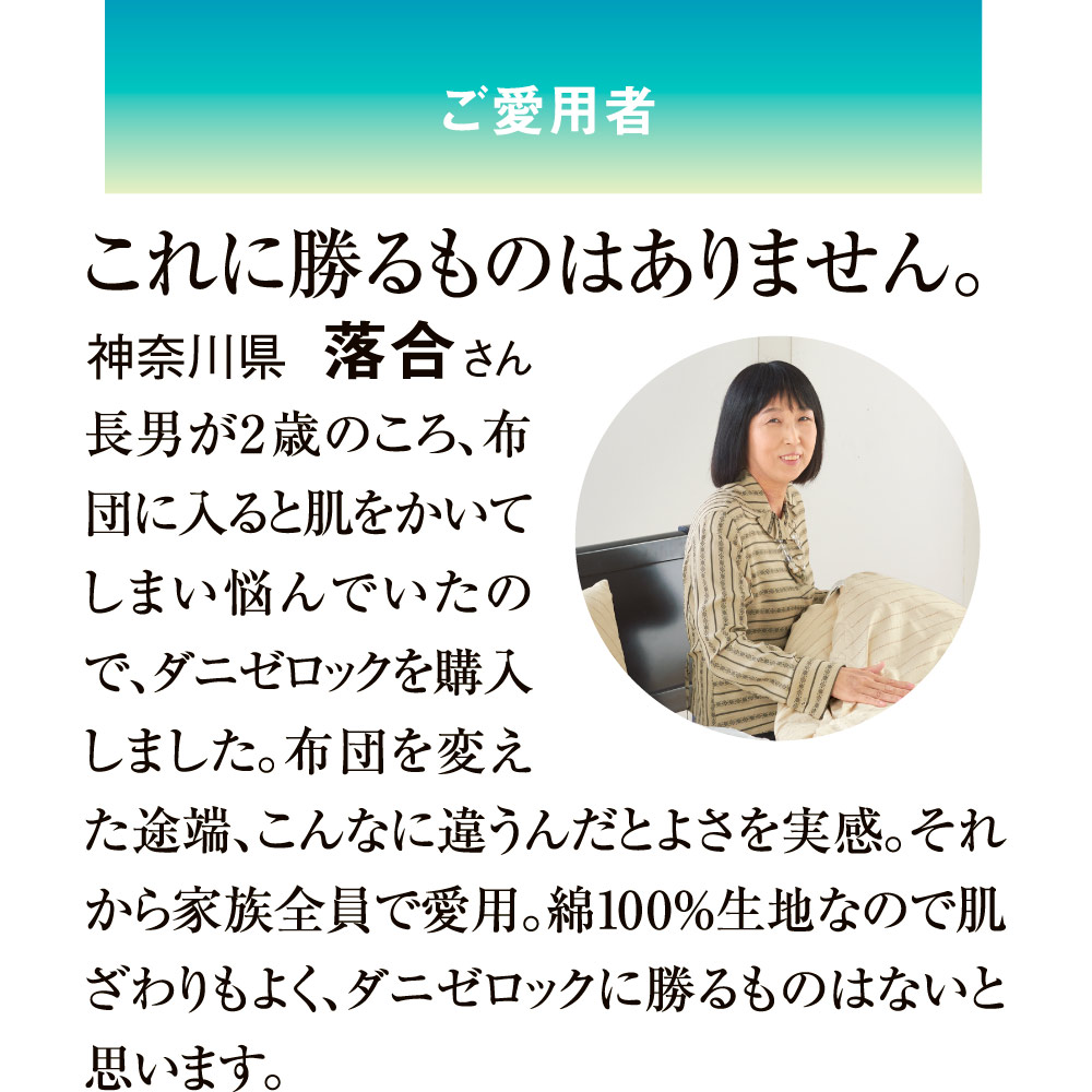 長男が2歳のころ、布団に入ると肌をかいてしまい悩んでいたので、ダニゼロックを購入しました。布団を変えた途端、こんなに違うんだと良さを実感。それから家族全員で愛用。旅行にもシーツ類を持って行きますし、社会人になって実家を離れた長男も使っています。綿100%生地なので肌触りもよく、ダニゼロックに勝るものはないと思います。これからも使い続けたいと思っています。