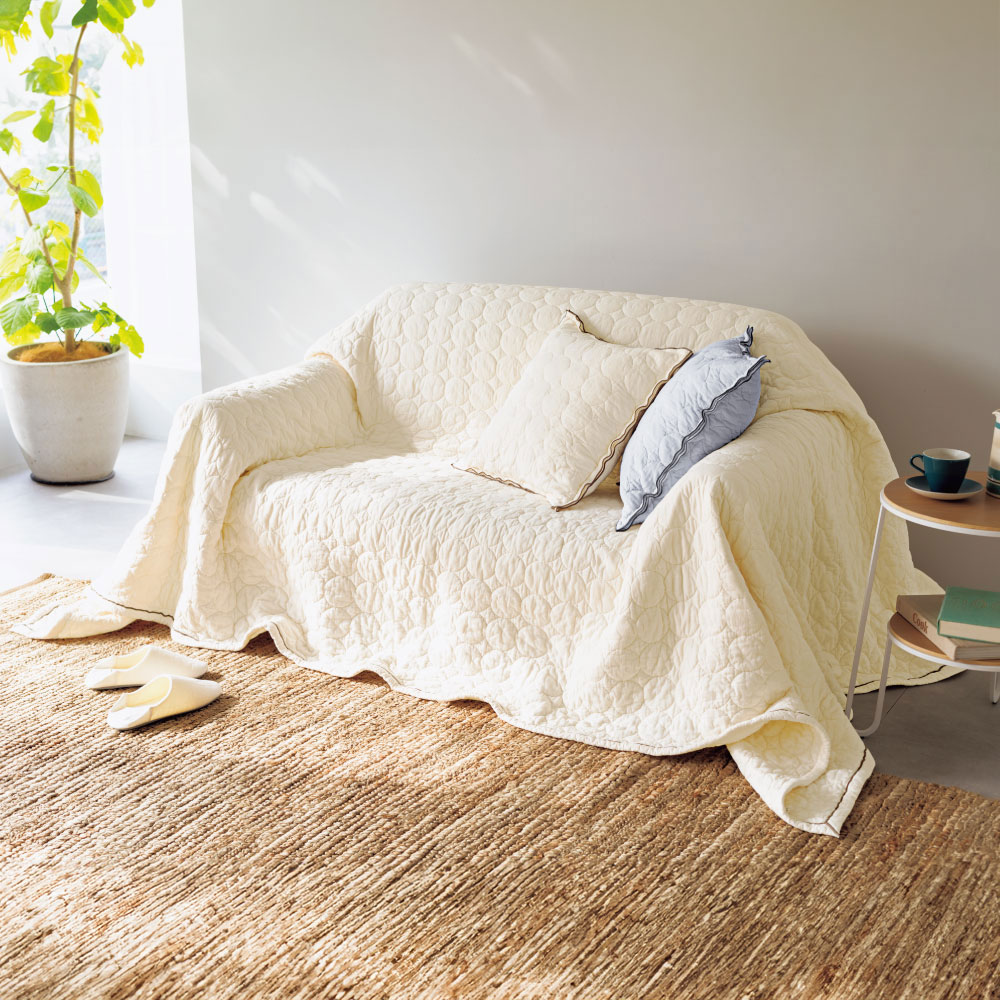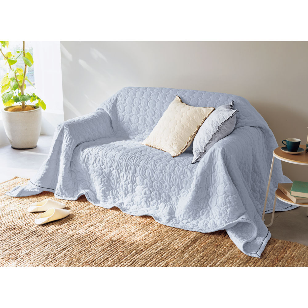 ふんわりサラリの肌ざわりで季節を問わず気持ちいいパシーマ生地で仕立てたマルチカバー。ソファをすっぽり包み込むゆったりサイズで、思わず寝転びたくなる気持ちよさ。ベッドカバーとして掛けることもできます。
