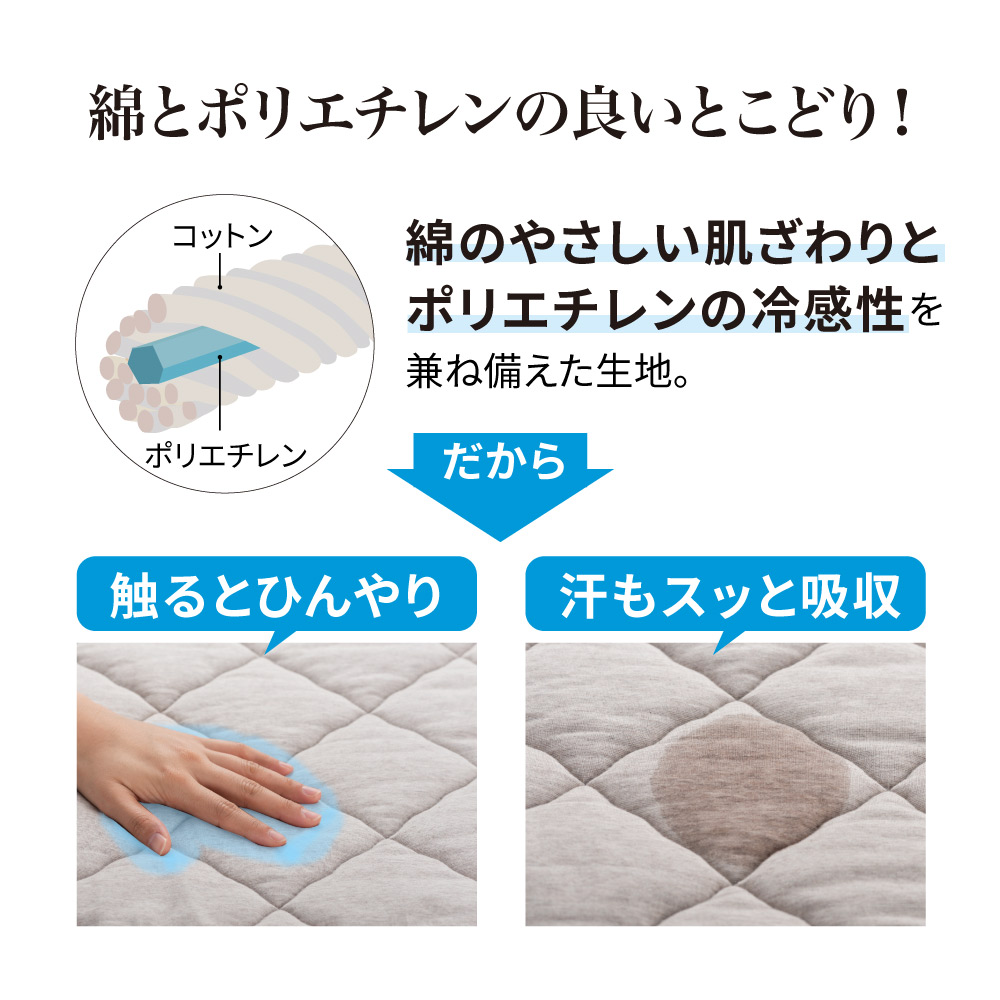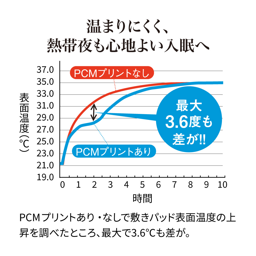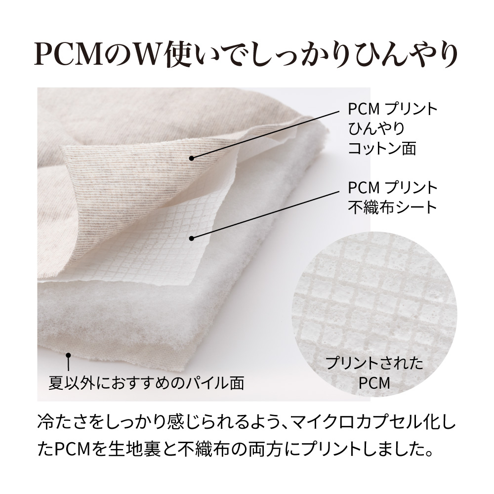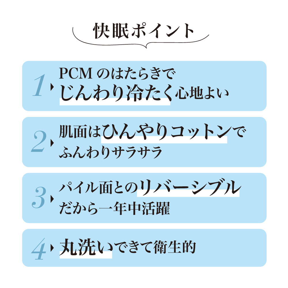 熱を吸収・発散して冷感を発揮するPCMの働きで、睡眠中の頭部を心地よくクールダウン。生地自体も冷感素材な上、綿の肌ざわりが楽しめます。