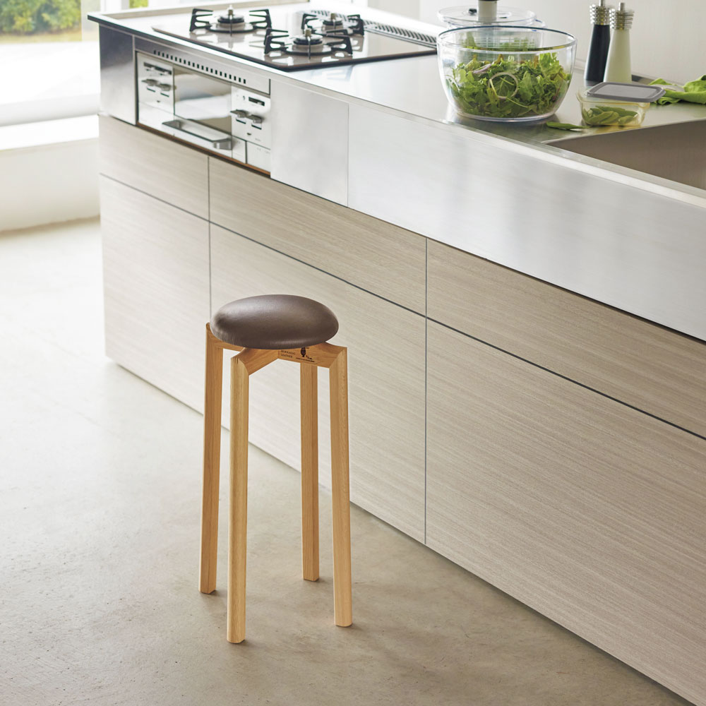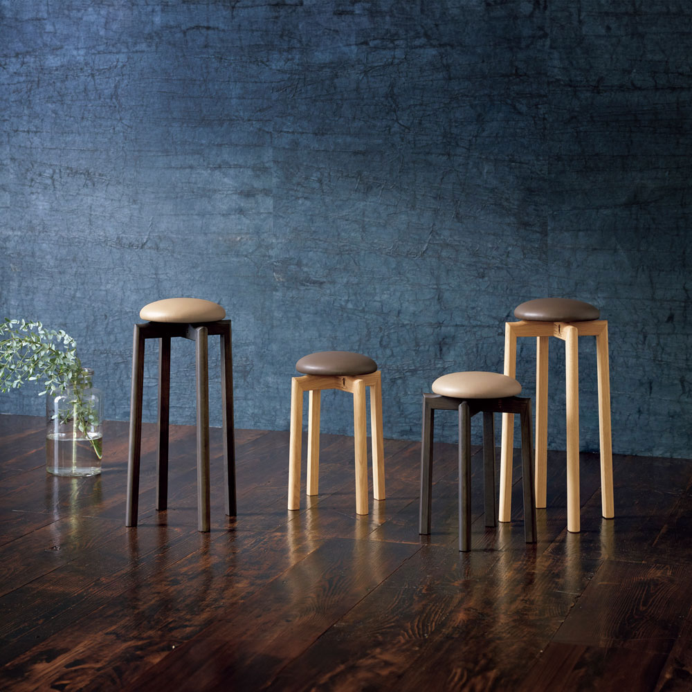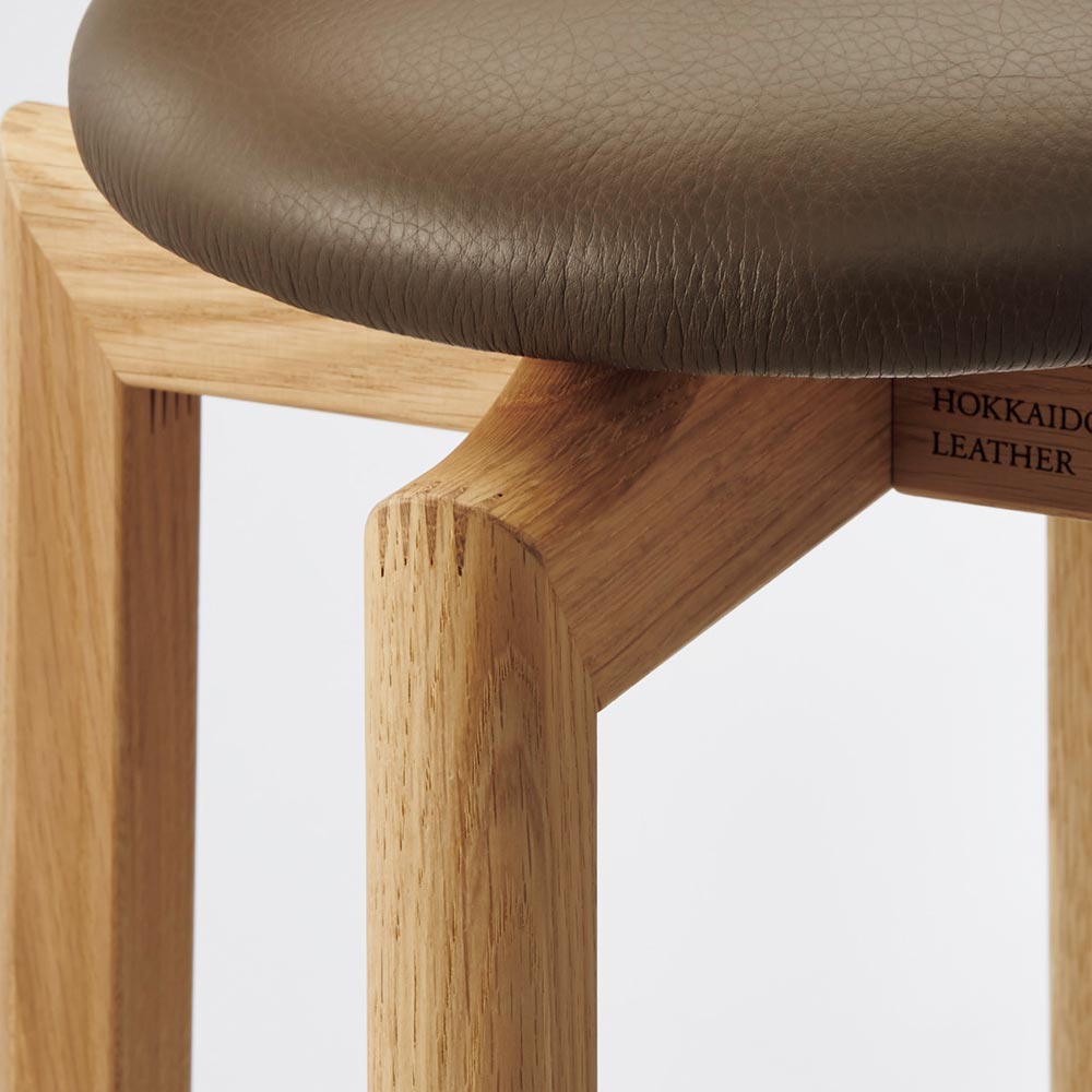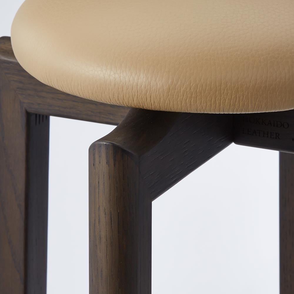 北海道ナラの木、北海道産牛革で旭川の家具職人が丁寧に仕上げたスツール。