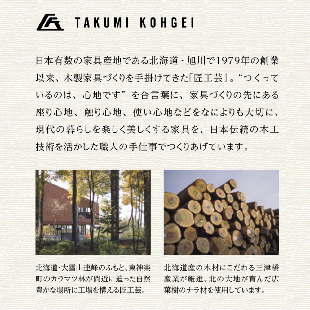 日本有数の家具産地である北海道・旭川で1979年の創業以来、木製家具づくりを手掛けてきた「匠工芸」。“つくっているのは、心地です”を合言葉に、家具づくりの先にある座り心地、触り心地、使い心地などをなによりも大切に、現代の暮らしを楽しく美しくする家具を、日本伝統の木工技術を活かした職人の手仕事でつくりあげています。