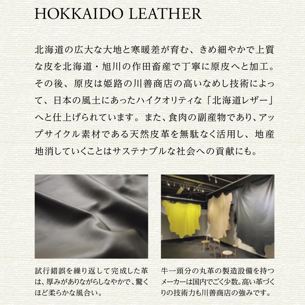 北海道の広大な大地と寒暖差が育む、きめ細やかで上質な皮を北海道・旭川の作田畜産で丁寧に原皮へと加工。その後、原皮は姫路の川善商店の高いなめし技術によって、日本の風土にあったハイクオリティな「北海道レザー」へと仕上げられています。また、食肉の副産物であり、アップサイクル素材である天然皮革を無駄なく活用し、地産地消していくことはサステナブルな社会への貢献にも。