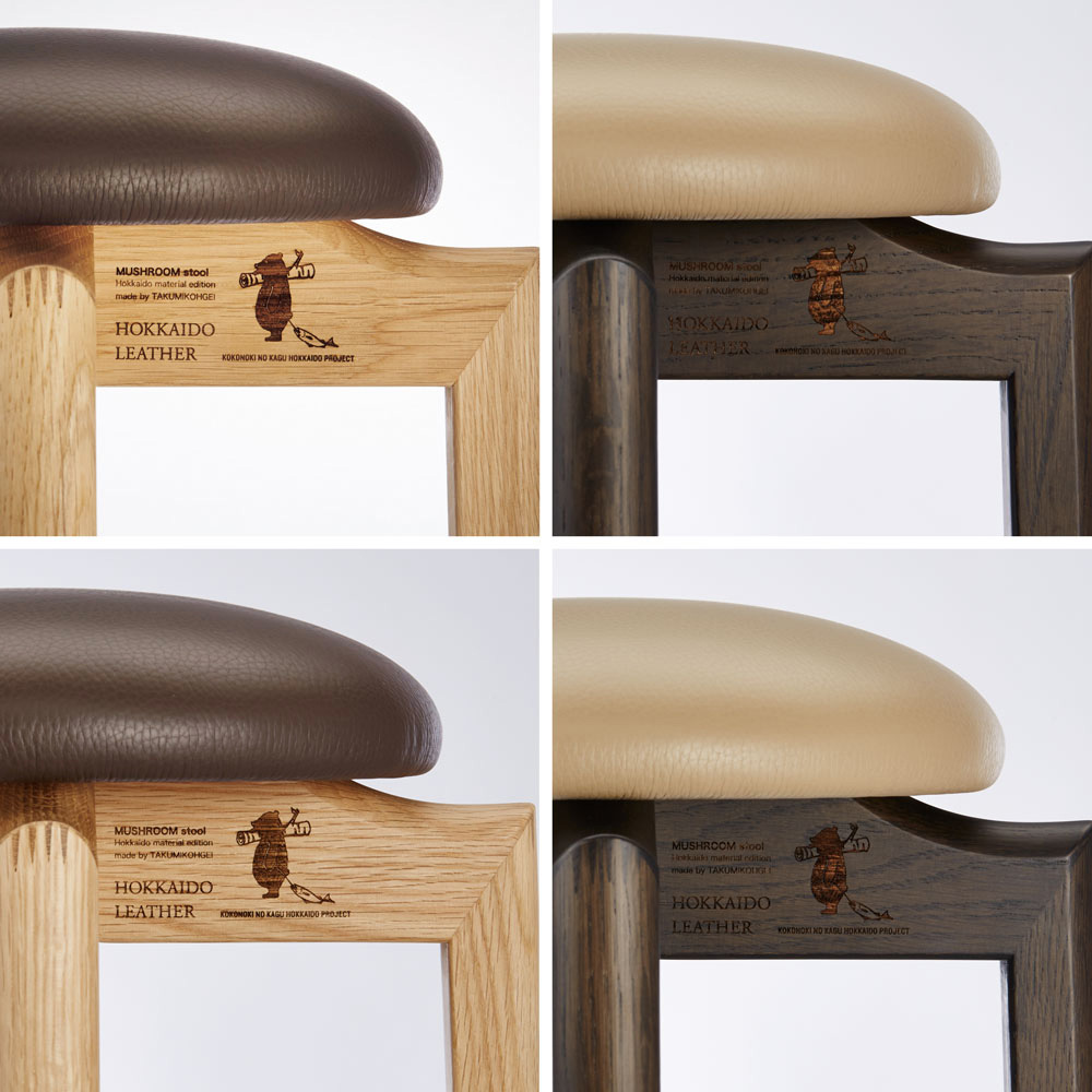また、海外から輸入するよりも運搬時のCO2削減に貢献する国産の家具用皮革「北海道レザー」の開発など、SDGsへの取組みを先駆けて行っています。その取組みにハウススタイリングが賛同し完成したのは、北海道産ナラ材と北海道レザーを掛合せた、こちらのマッシュルームスツール。環境に配慮するだけではなく、美しく便利で、心地よく、長く使える――。旭川家具が誇る熟練職人の高い技術と北の大地の恵みに育まれた、まさにサステナブルなスツールです。