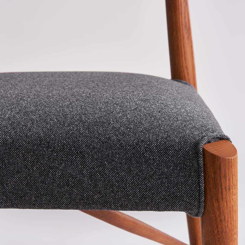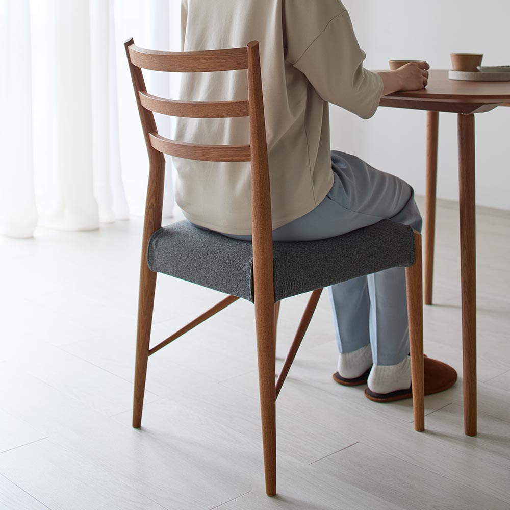 毎日使う椅子はできるだけ軽くて丈夫であるべきという信念から生まれ、1996年の生産開始以来、日進木工の代表的なチェアのひとつです。シートにはダイメトロールという布バネを使用し、軽量化に貢献。長時間座っていても底付き感がなく、通気性も良いので快適です。シートカバーは取り外しが可能で、 汚れたときは手洗いが可能。取り入れやすいヴィンテージカラー