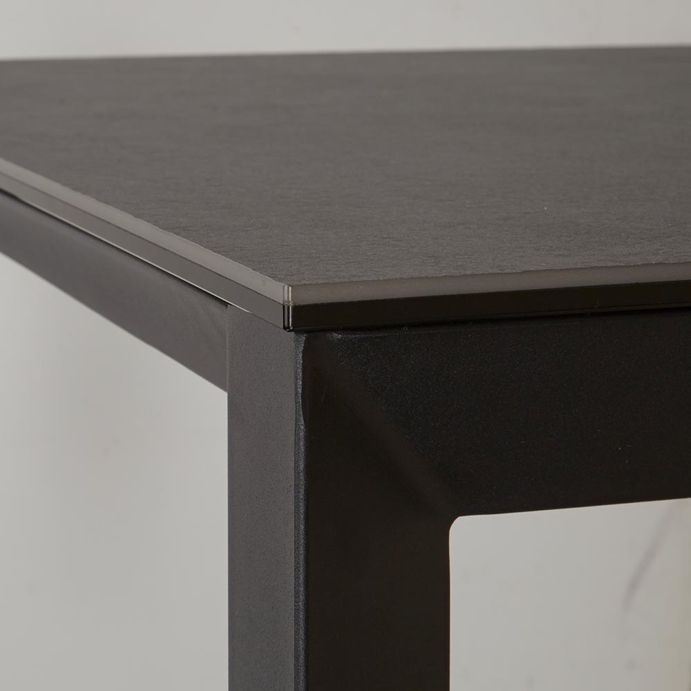 セラミックトップの表面は、焼きものならではの凹凸のあるテクスチャ。従来の天板素材とは全く異なる素材感です。また色あせや変色の原因となる空気や紫外線に対しても、耐性が強いので、綺麗な天板が長持ちします。商品画像の説明。