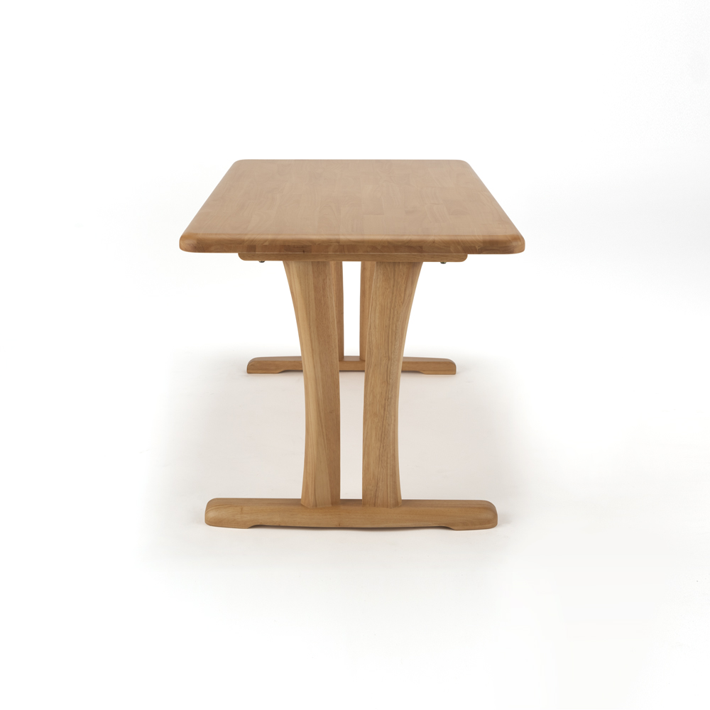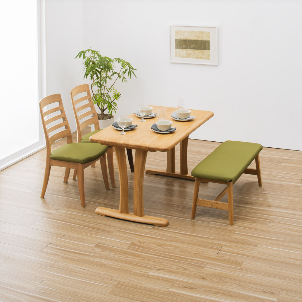 ダイニングテーブルは2タイプ×4サイズ、チェアは肘無しタイプと肘あり回転タイプ、ベンチは2サイズをご用意しております。ご夫婦お二人でゆったり使いたいときは幅90タイプを、子どもがいらっしゃる4名以上のご家庭にはお部屋の広さに併せて幅125・140・165を選ぶなど、家族構成に合わせてコーディネートをお楽しみください。※テーブルとベンチの組み合わせ例(脚の間に入るサイズ)