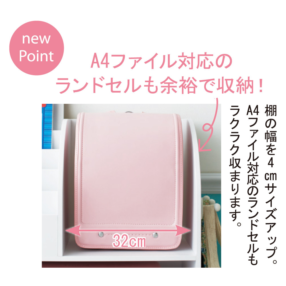 【A4ファイル対応のランドセルも余裕で収納!】棚の幅を4cmサイズアップ。A4ファイル対応のランドセルもラクラク収まります。