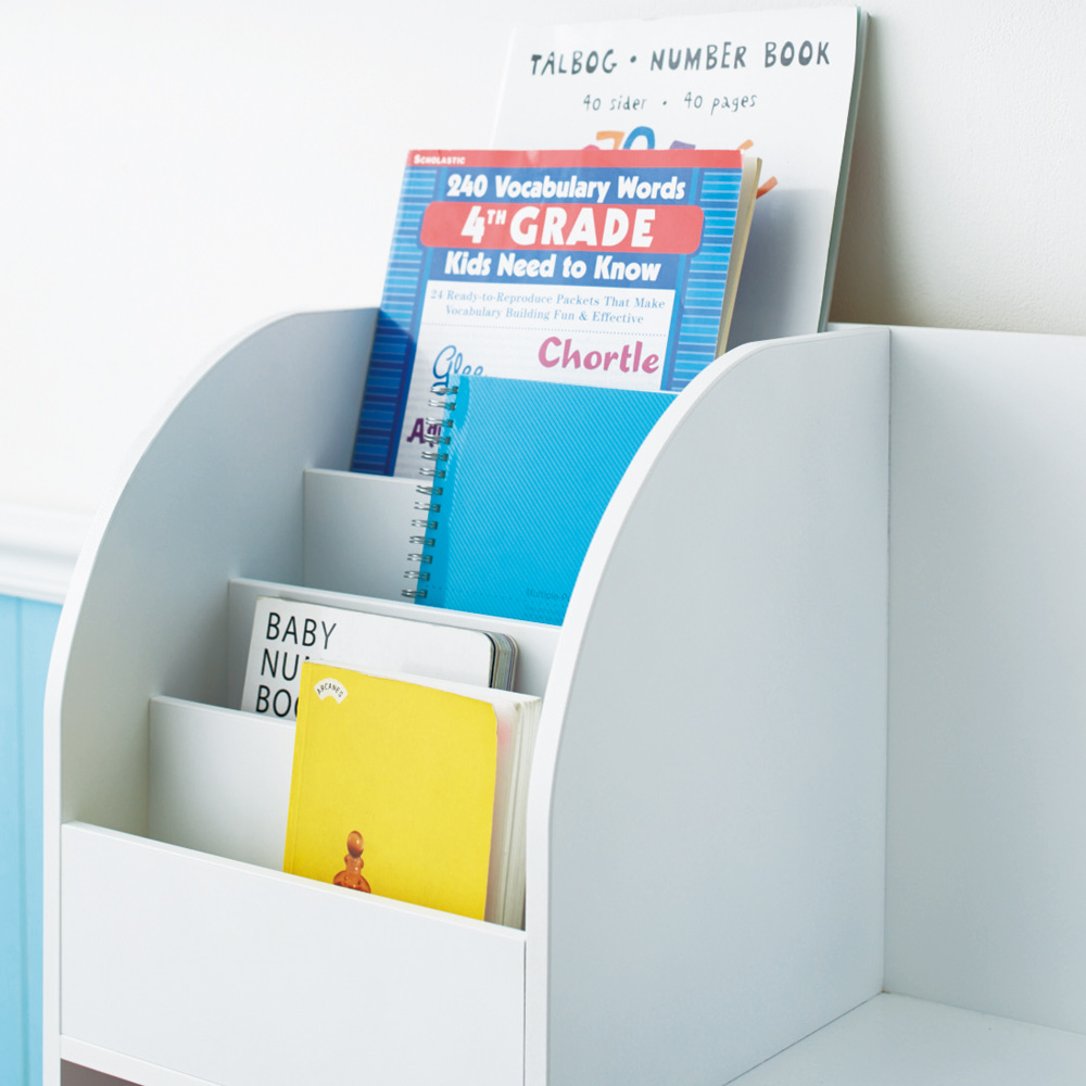 ⇒階段状のマガジンラックは表紙が見えるから教科書や宿題プリントの分類収納に便利