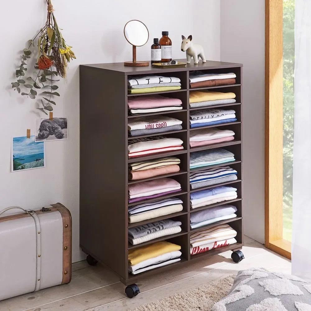 深い引き出しにしまい込むと、掘り起こさなければ目的の服が見つからないことも…このラックには前板がないので、しまった洋服が一目瞭然、すぐに見つかります。