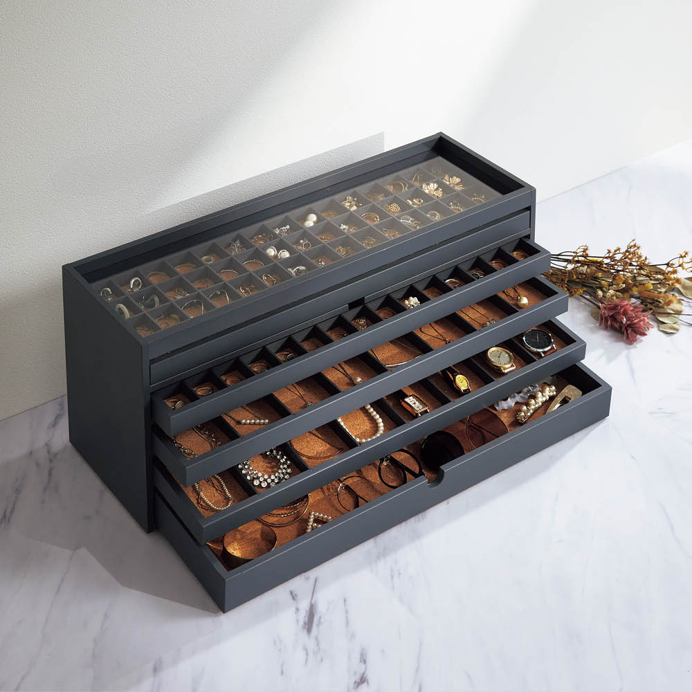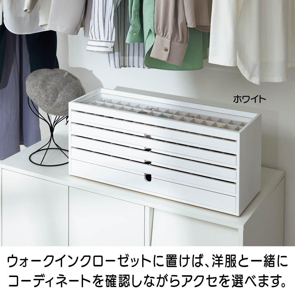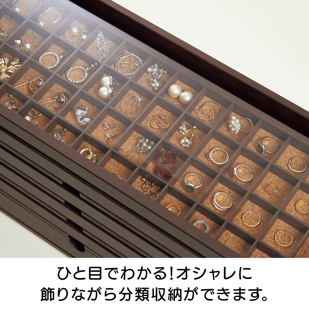 1段目は天板が透明のアクリルなので、閉めたままでも上から中を見ることができます。お気に入りのアクセを並べるだけで、華やかなディスプレイが完成。