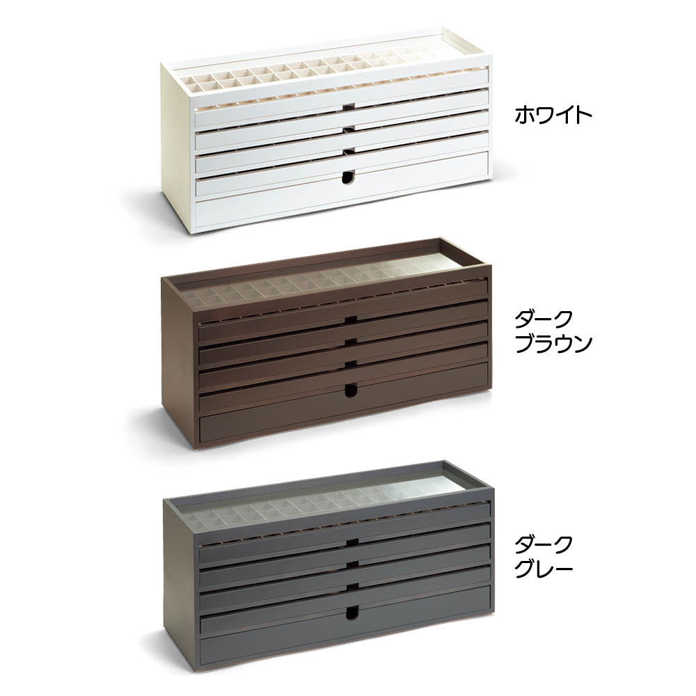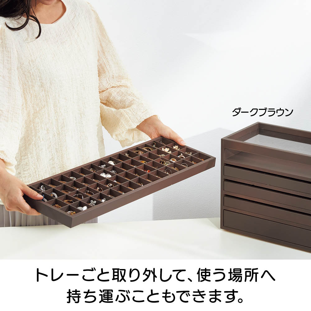 各段のトレーはそれぞれ取り外せるので、奥に置いたアクセが取り出しにくいということもありません。1~4段目は高さが同じなので、好きなトレーを一番上に入れてディスプレイを楽しめます。
