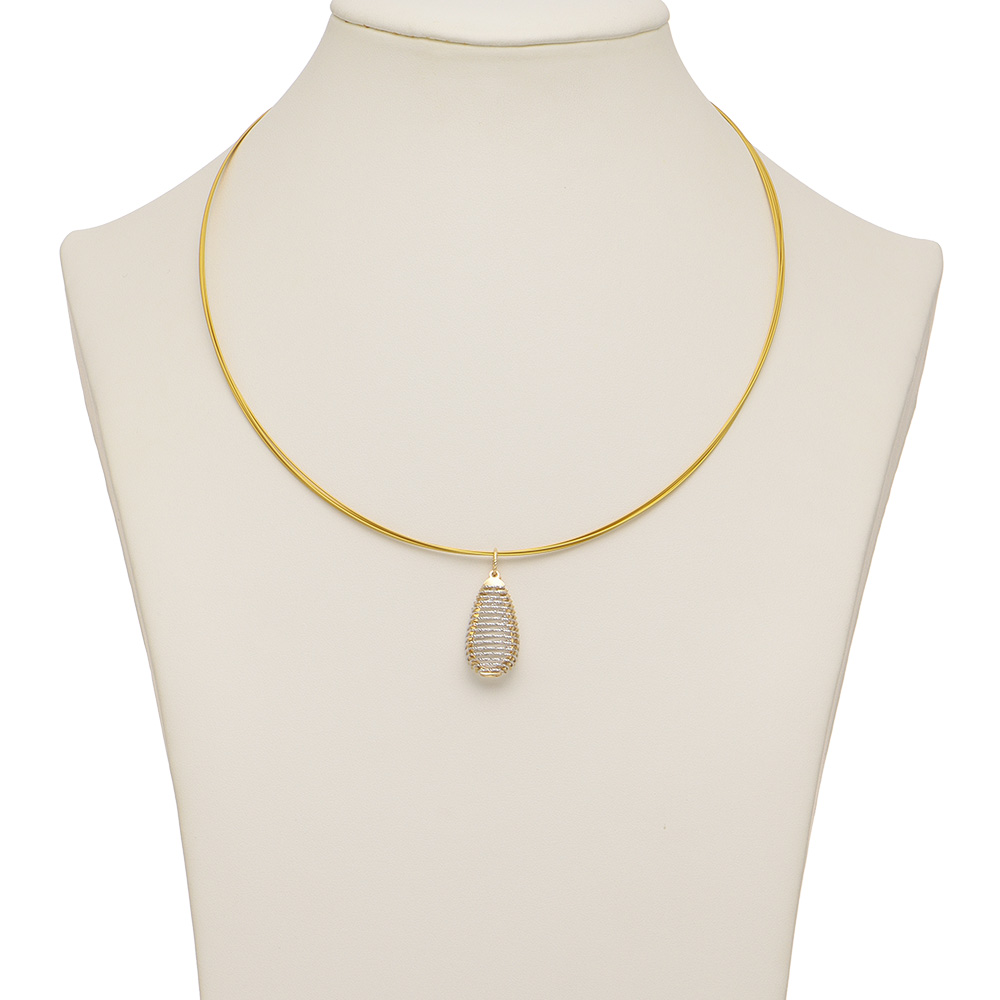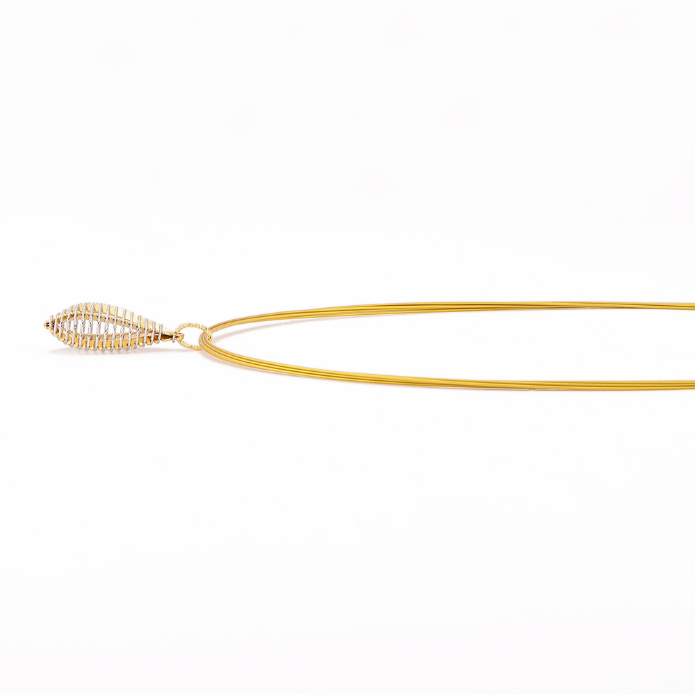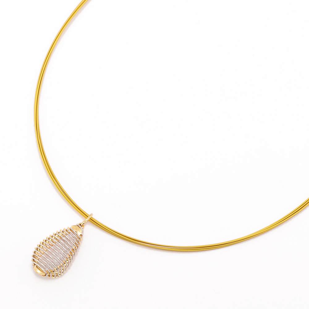 ゴールドジュエリーはエアリー&ボリューミーが最旬キーワード。特に今シーズンはオメガネックレスの人気が再燃。軽やかで重ねても抜け感があり、涼やかな華やぎが日差しに映えます。 イタリアの熟練職人がYGのベースにWGの金線を巻いたドロップのヘッドに、カラーの多連ワイヤーを配したペンダント。商品画像の説明