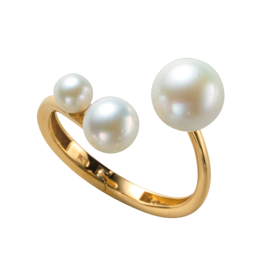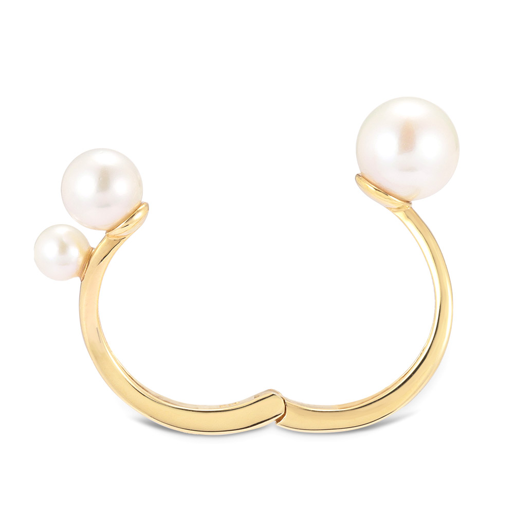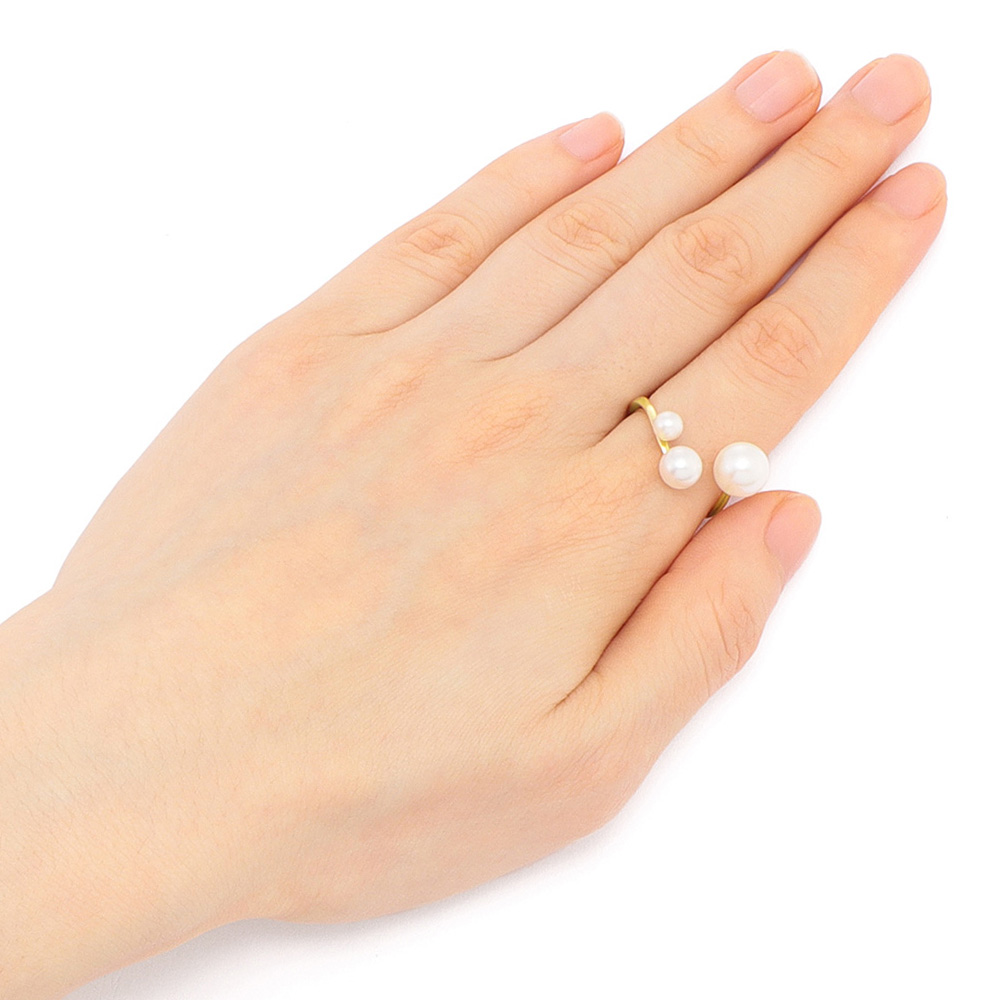 指を挟み込んで着けるアジャストリング。サイズの異なるアコヤパールをセットした可憐なデザイン。商品画像の説明