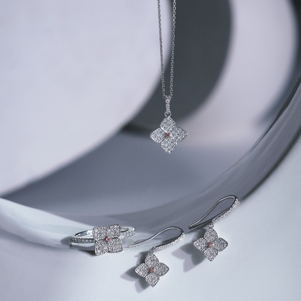ピンクダイヤモンドを抱いた花が、大人の愛らしさを呼び覚ます。