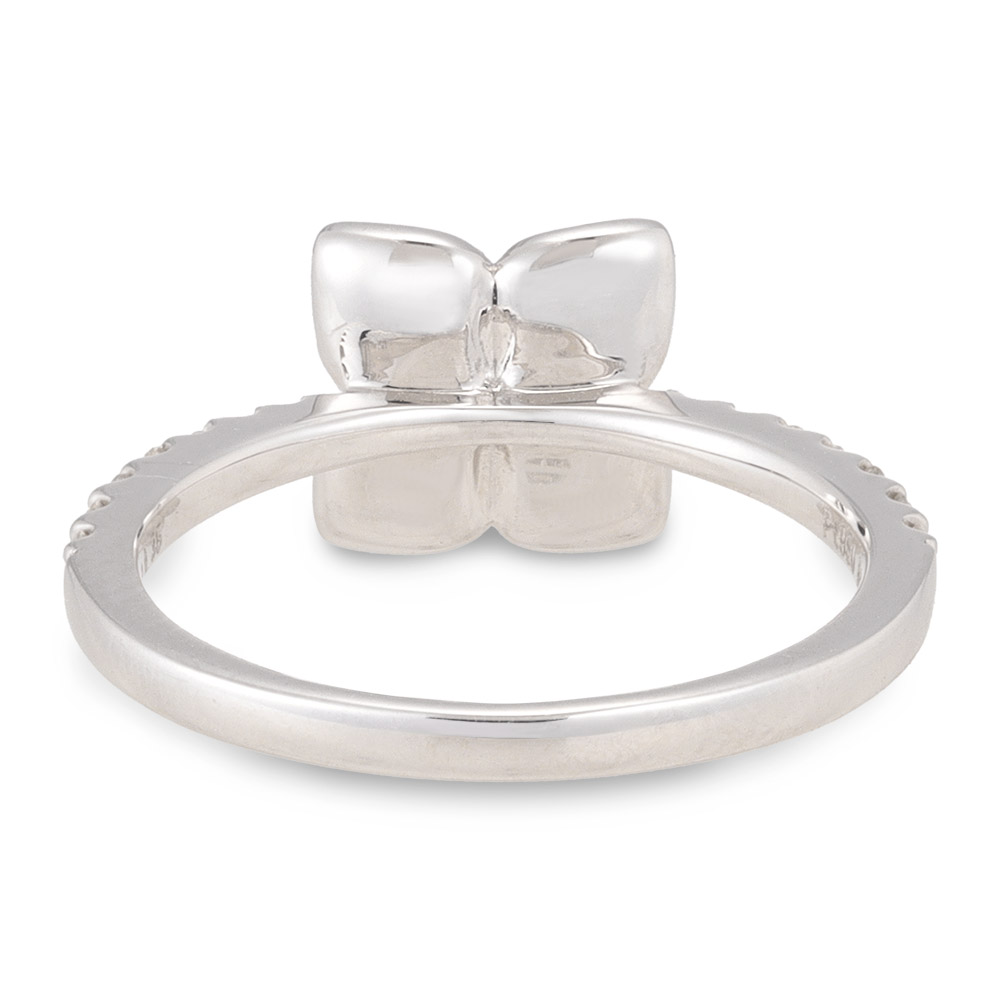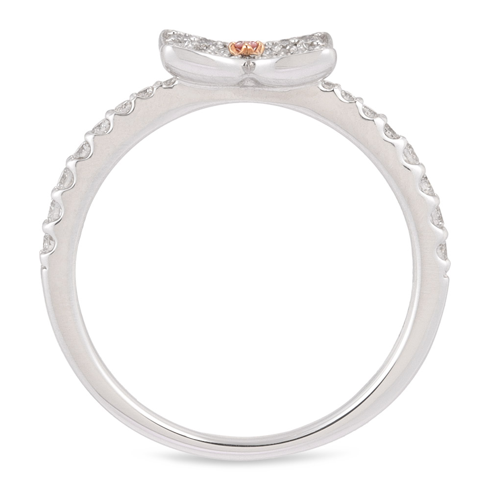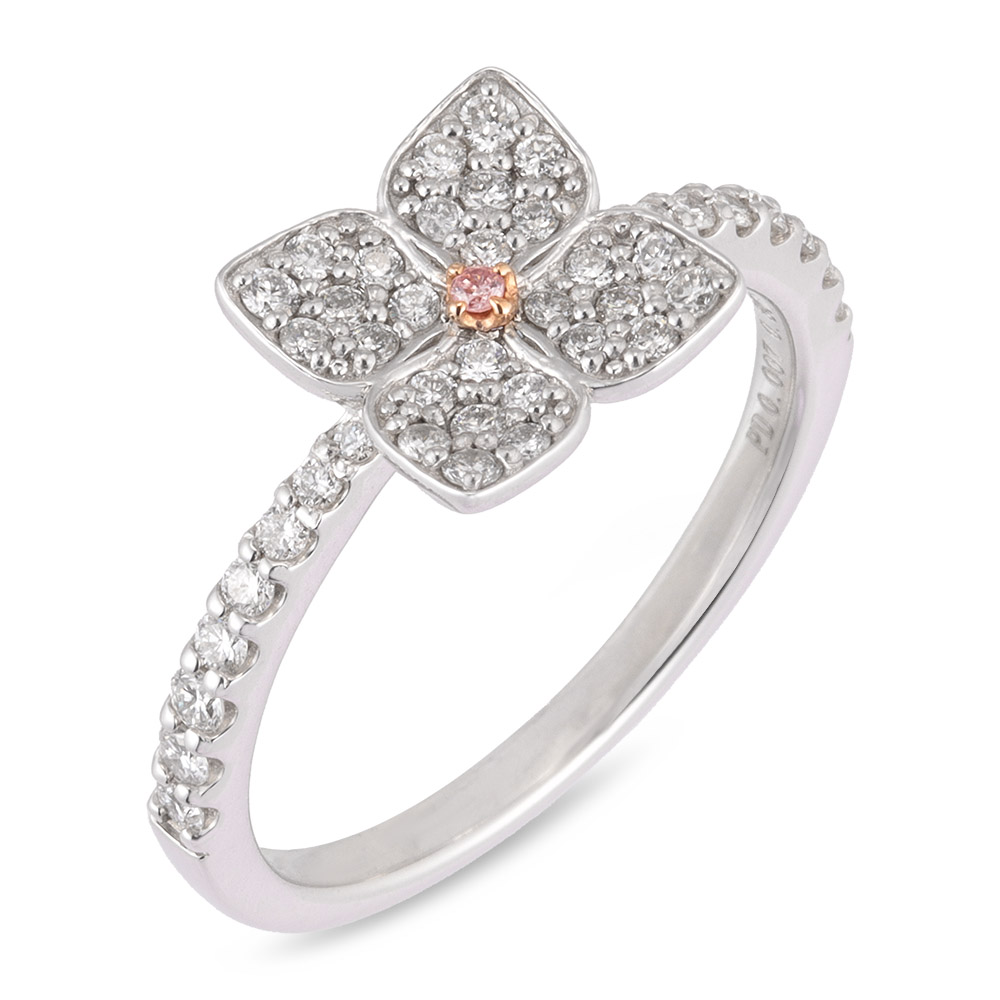 カラーダイヤの中でも屈指の人気を誇るのが、ほんのりロマンティックな甘さを醸すピンクダイヤです。とりわけクリアな色合いを誇るピンクダイヤは、ジュエリー通も垂涎の逸品。産出量・流通量が極めて少なく、ますます希少価値が高まっているピンクダイヤを、パヴェダイヤの花びらが可憐なフラワーデザインにセット。パープリッシュピンクのダイヤの美しさが際立ちます。