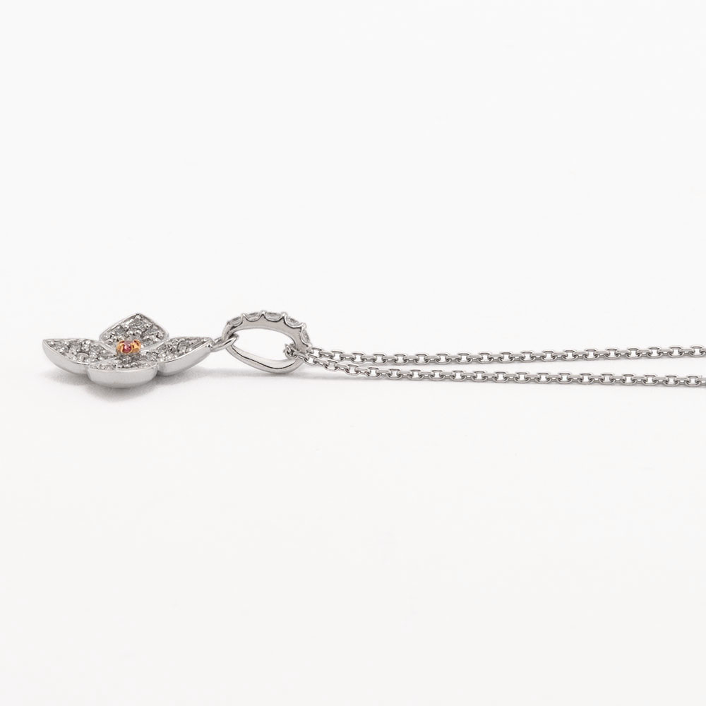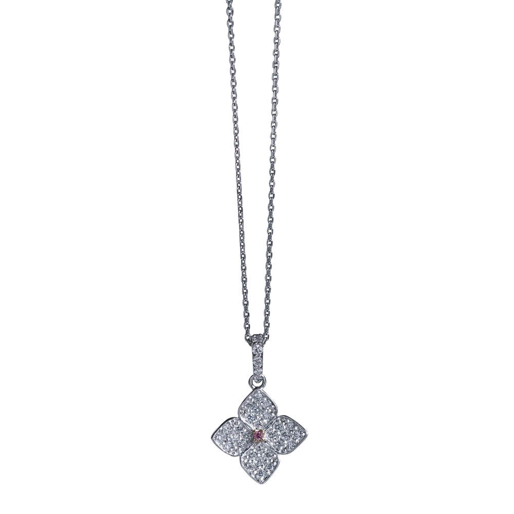 カラーダイヤの中でも屈指の人気を誇るのが、ほんのりロマンティックな甘さを醸すピンクダイヤです。とりわけクリアな色合いを誇るピンクダイヤは、ジュエリー通も垂涎の逸品。産出量・流通量が極めて少なく、ますます希少価値が高まっているピンクダイヤを、パヴェダイヤの花びらが可憐なフラワーデザインにセット。パープリッシュピンクのダイヤの美しさが際立ちます。デコルテでエレガンスを物語るペンダントは、初対面の相手にも好印象。数量限定なので、ぜひお早めに!