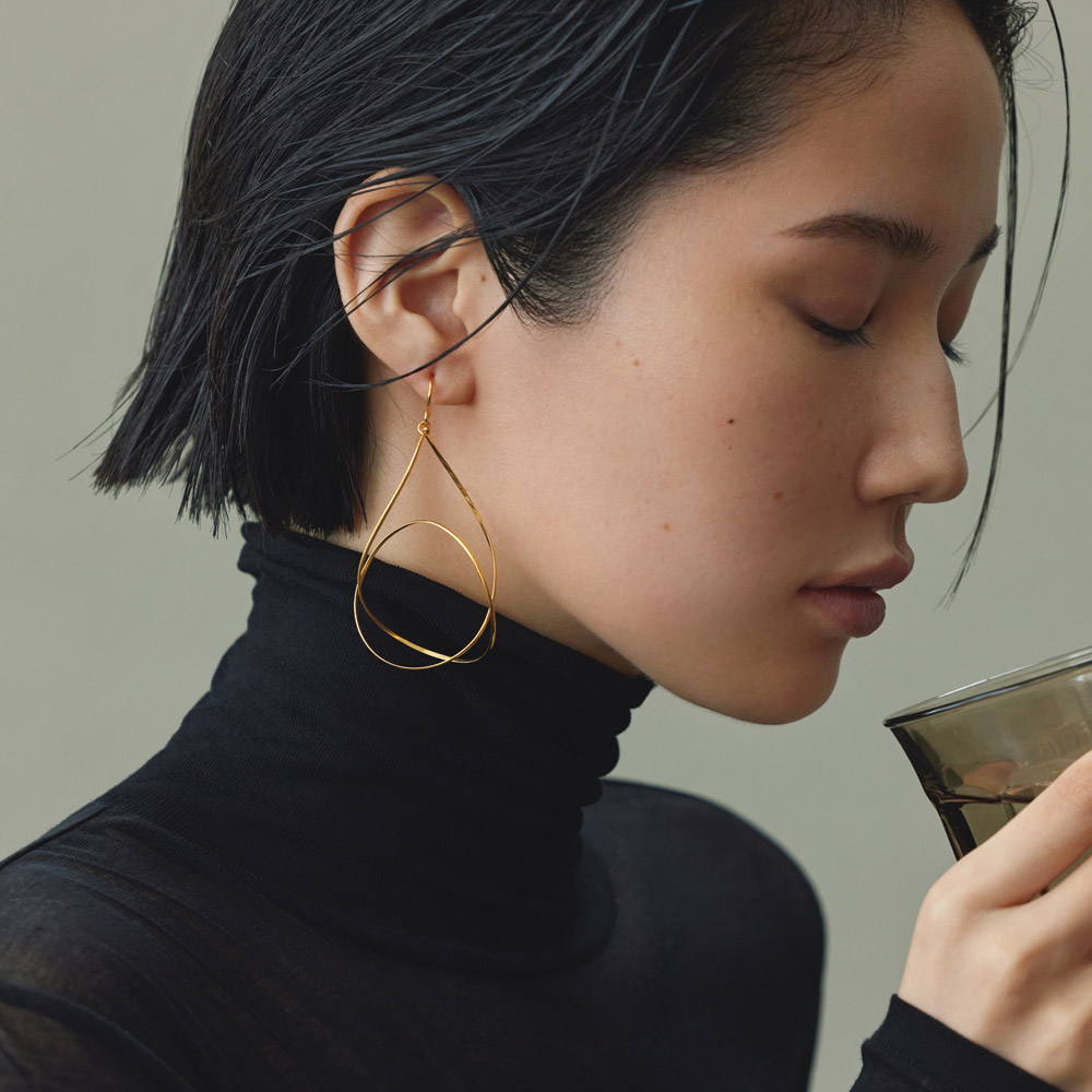 アートピースのようなデザインが、どの角度から見られても顔周りに洗練された印象を演出するピアス。流麗なラインを描くピアスは、職人が手作業で仕上げたもの。一点一点微妙に表情が変わるのも格別な味わいです。