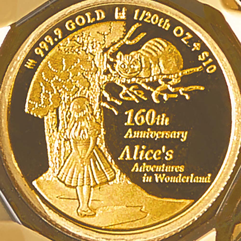 「不思議の国のアリス」の出版160周年を記念し2025年に英国王立造幣局が製造した世界限定1400枚の純金コイン。心が和むチェシャ猫とアリスの出会いの場面の柄が、両面のカットガラスの中でいつまでも美しく輝きます。