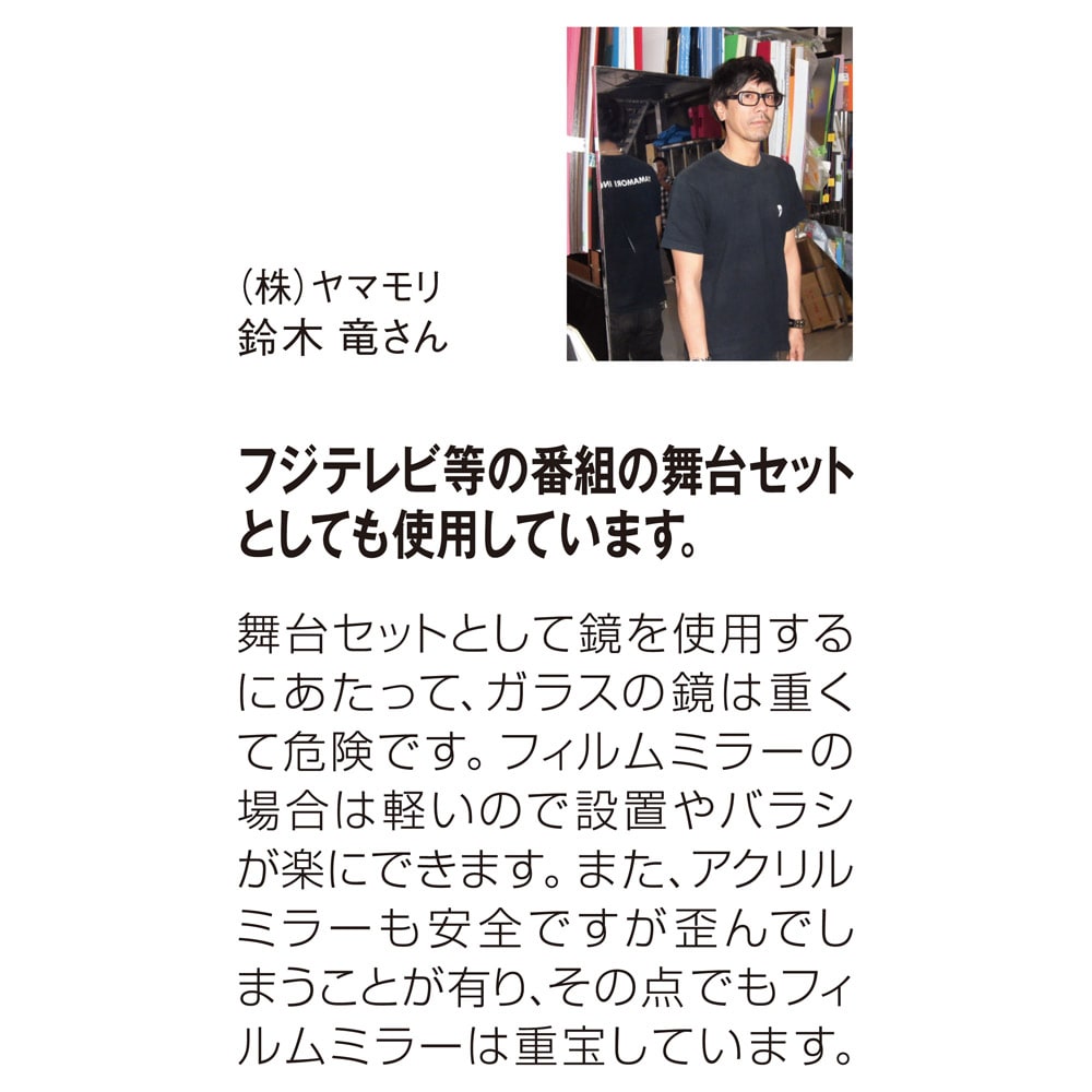 • 一般的なミラーと、割れない軽量フィルムミラーの比較。
