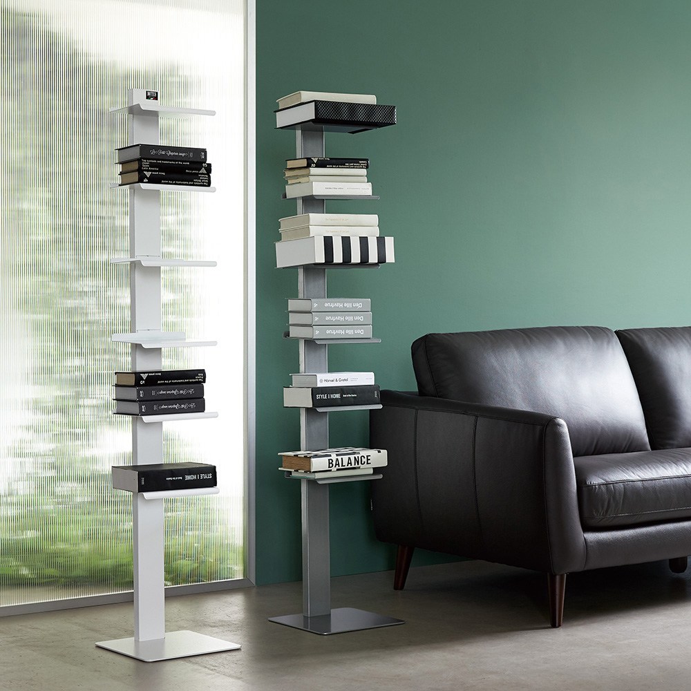 左からホワイト、グレー シンプルを極めた佇まいの、イタリア製のブックシェルフ。本を無造作に置くだけでも様になり、お気に入りの小物を並べて見せる収納にも。棚板の位置は固定されています。