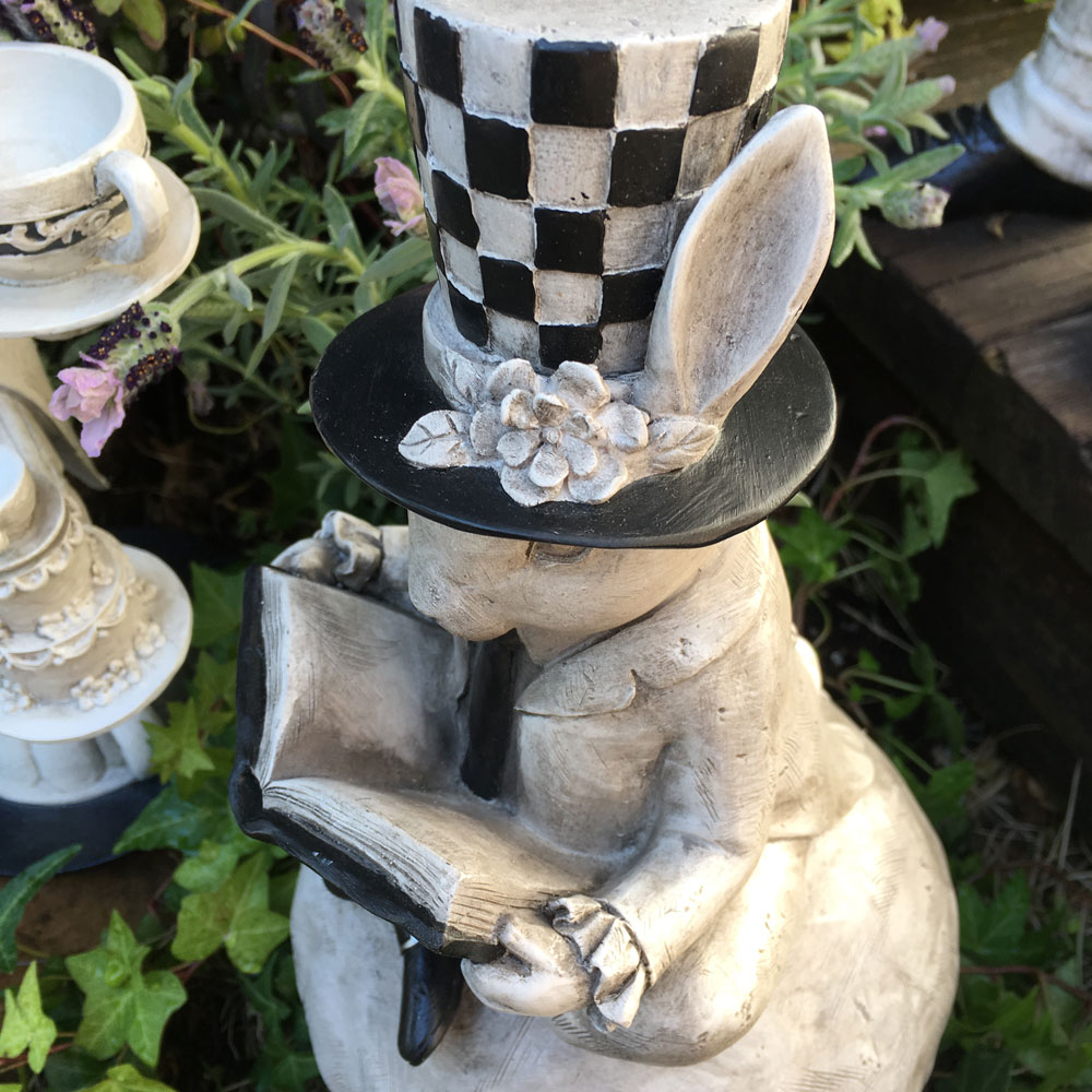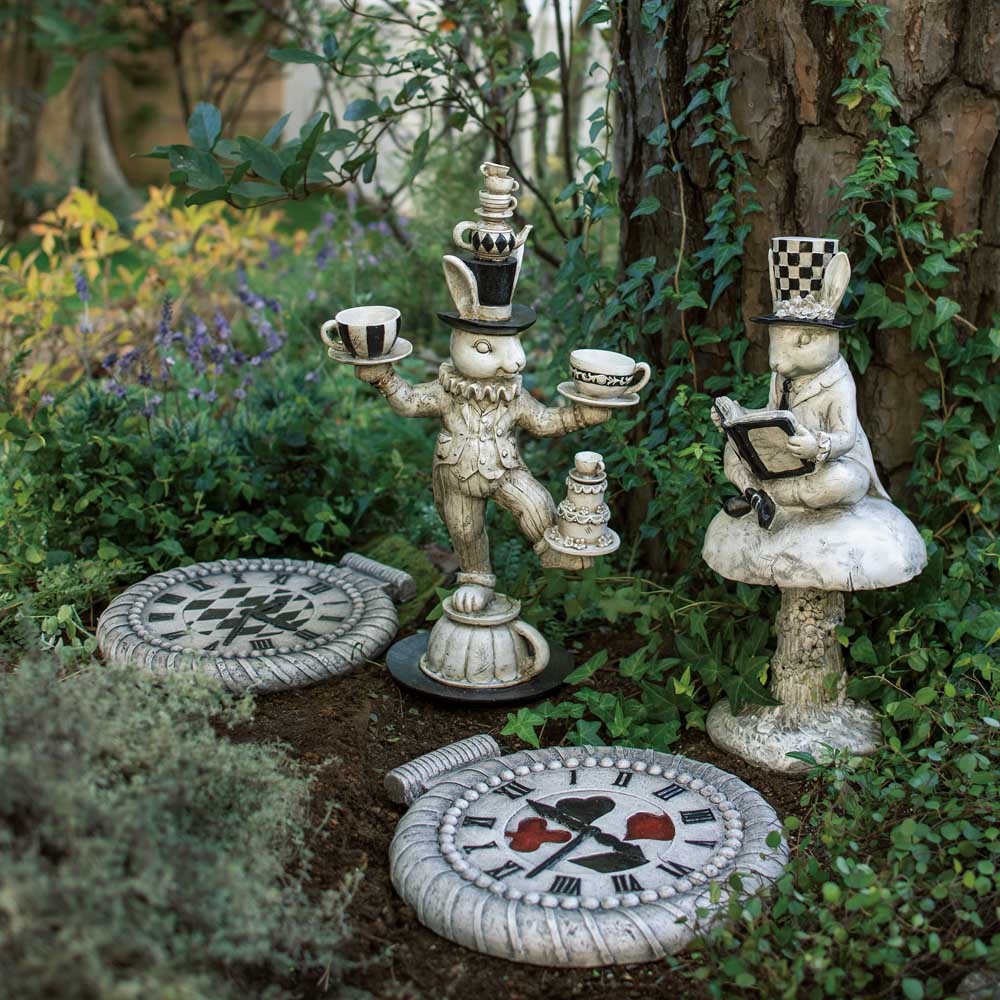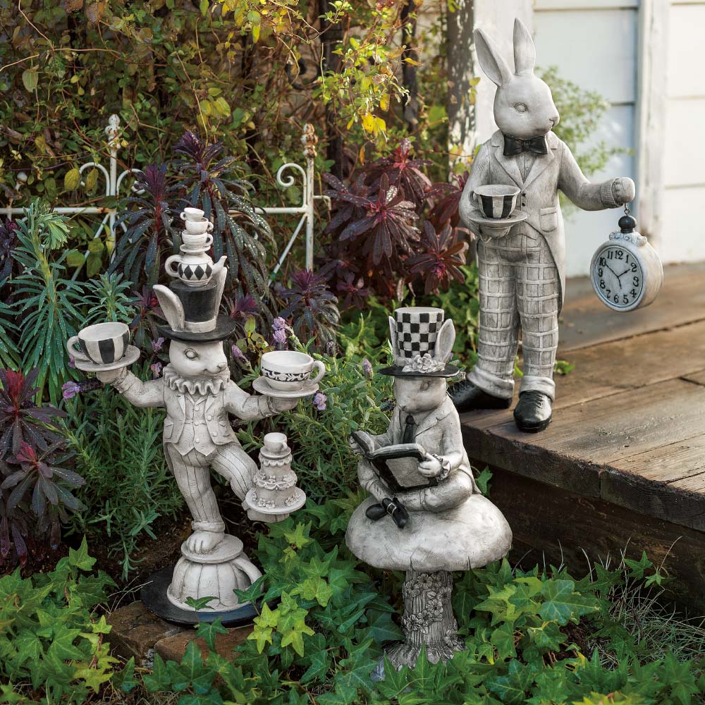 ティーパーティを繰り広げるウサギが庭に物語性をプラス。ストーン調のレジン素材が大人っぽい印象です。